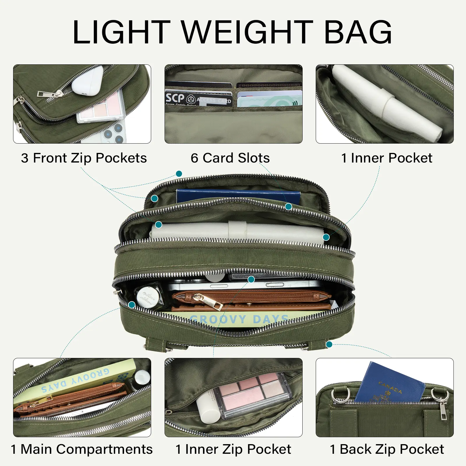 ·[MULTIPLE POCKETS for ORGANIZING] - The crossbody sling bag has up to 7 pockets.The interior of purse is made of 1 large main compartment pocket,1 inner zipper pocket,3 front zipper pockets and 6 card slots,1 Back zipper pocket on the outside.With various pockets for you to choose, you can organize your phone,keys,cards,cash, earphones, and other accessories.