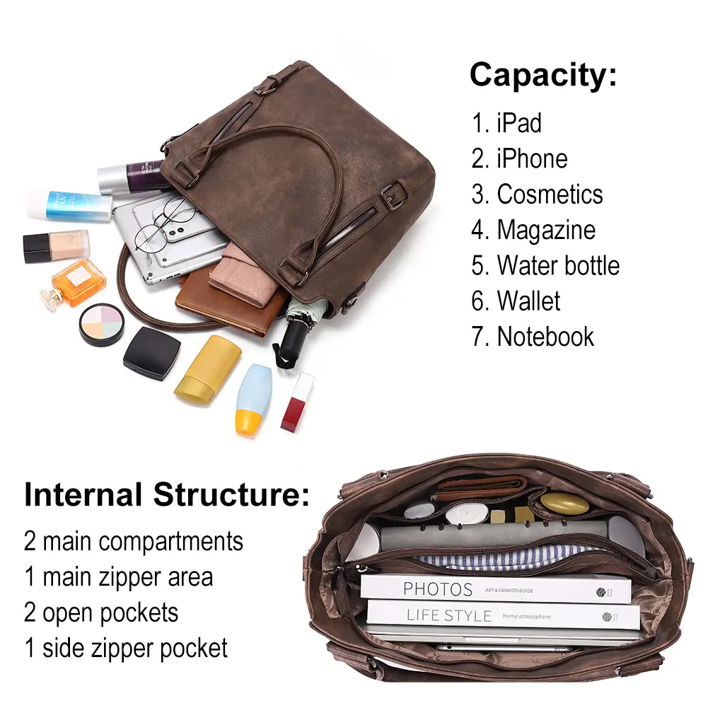 This spacious bag can easily hold your iPad, phone, wallet, water bottle, cosmetics, umbrella, keys, and more.