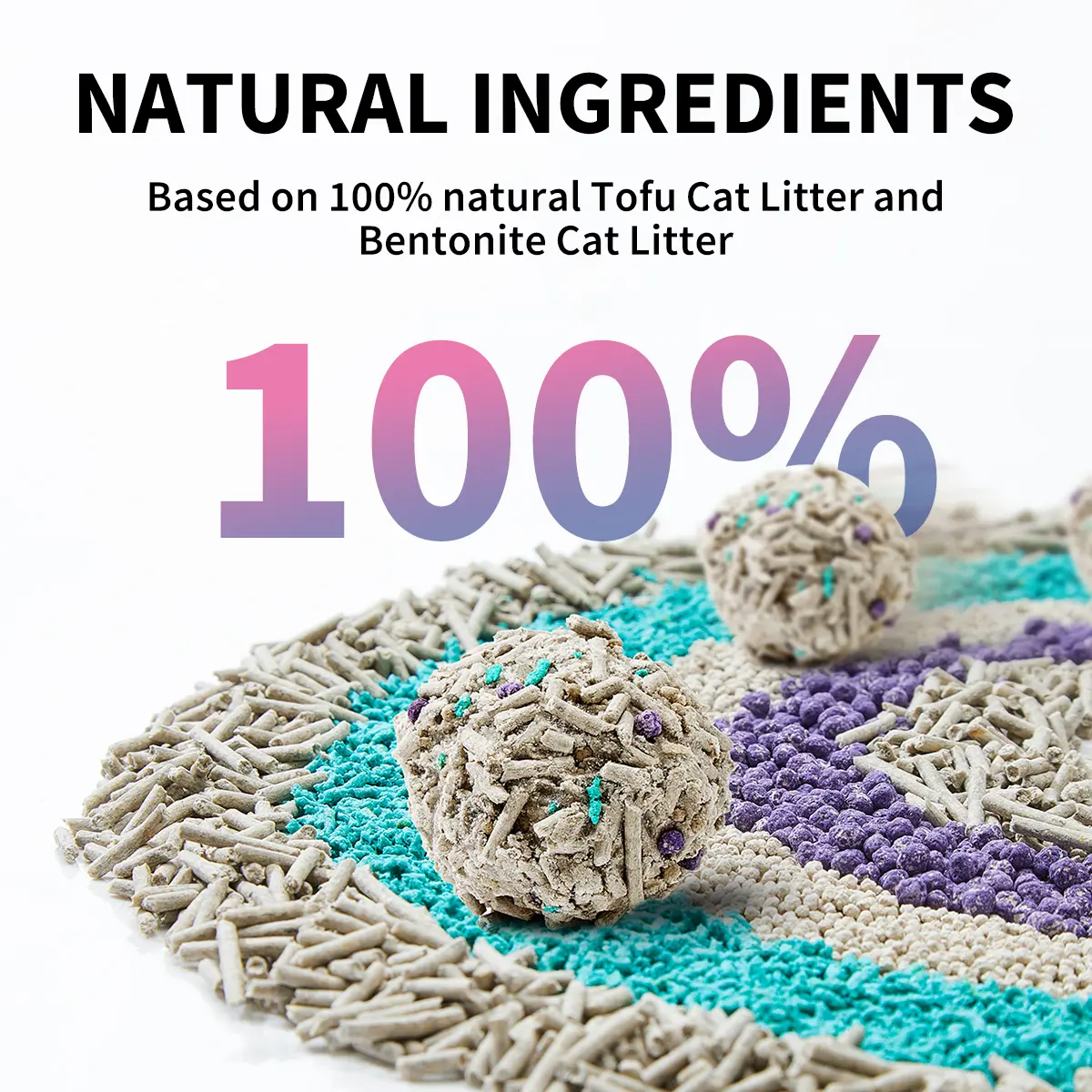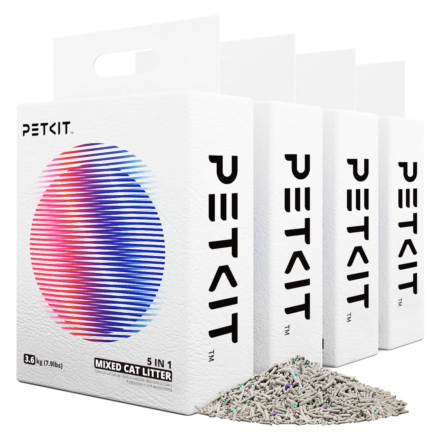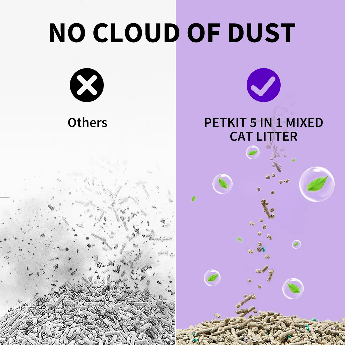 5-in-1 Mixed Cat Litter: PETKIT mixed cat litter is rapid clumping, max water absorption, max deodorization,anti-sticky, and dust-free, always keeps the air fresh. Made of all-natural ingredients, 67.66% tofu cat litter and activated carbon,29% bentonite cat litter,2.91% litter mate, and 0.43% deodorant particles.
