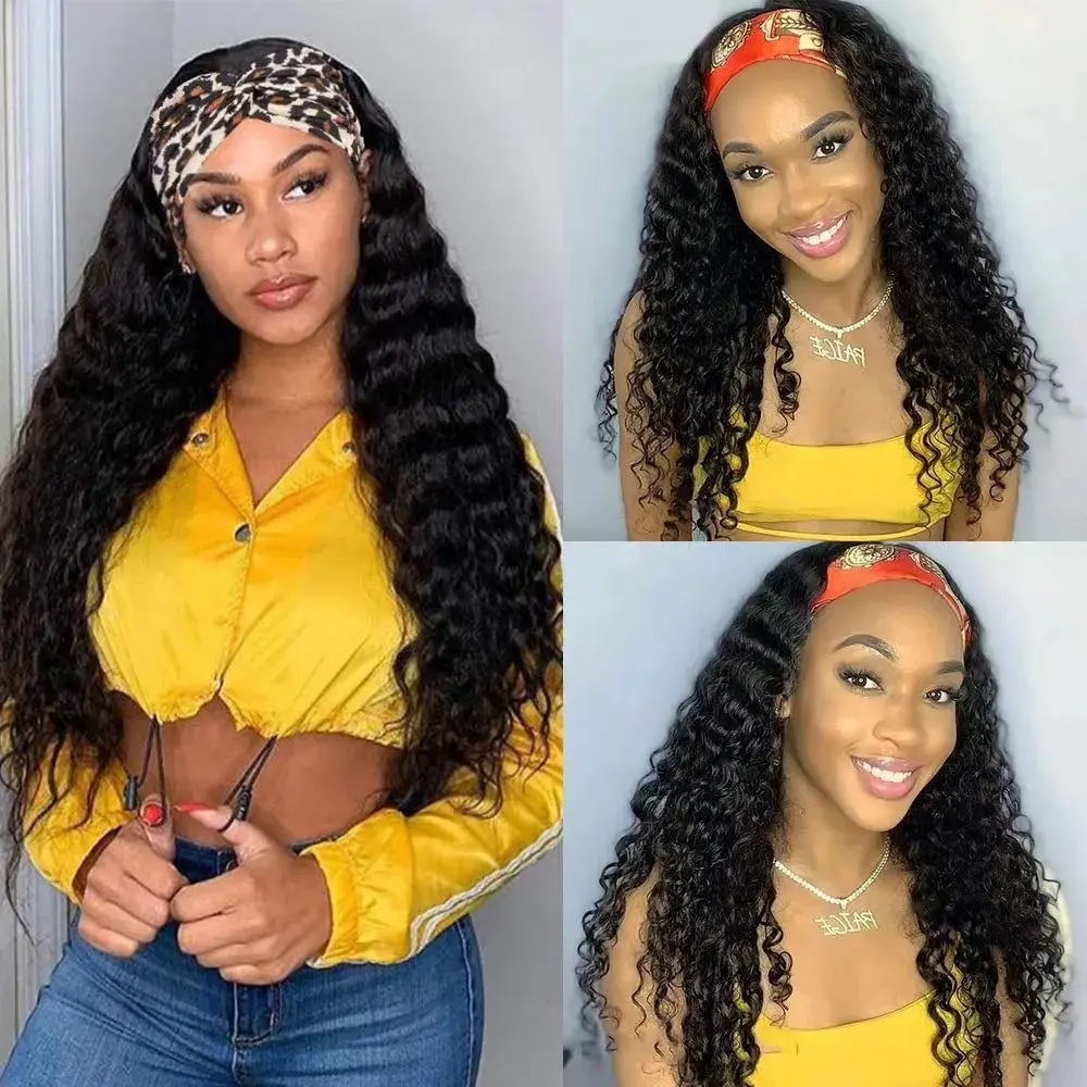 Headband Wig Human Hair Deep Wave 18 inch None Lace Front Wig Human Hair Machine Made Wigs Glueless Curly Hair Headband Half Wigs for Black Women Human Hair Natural Color