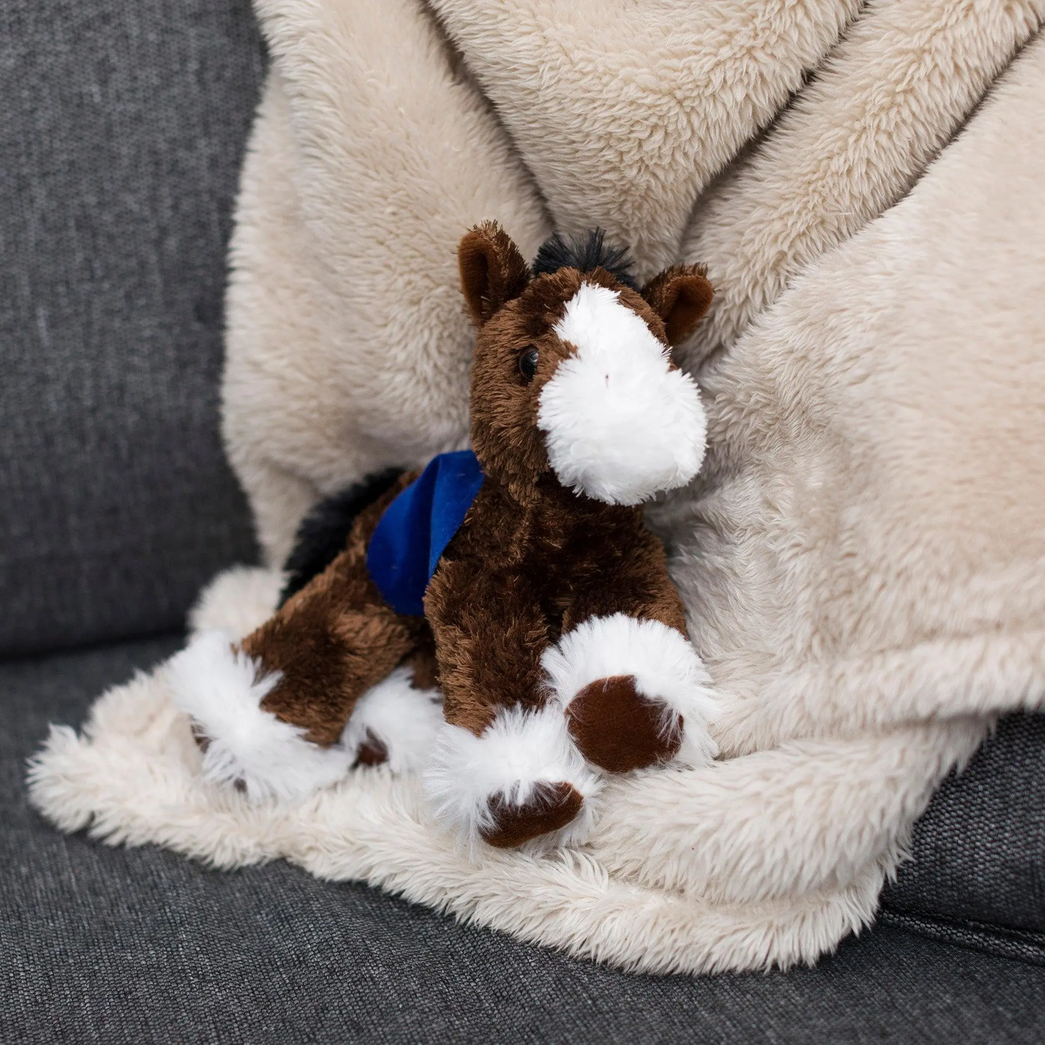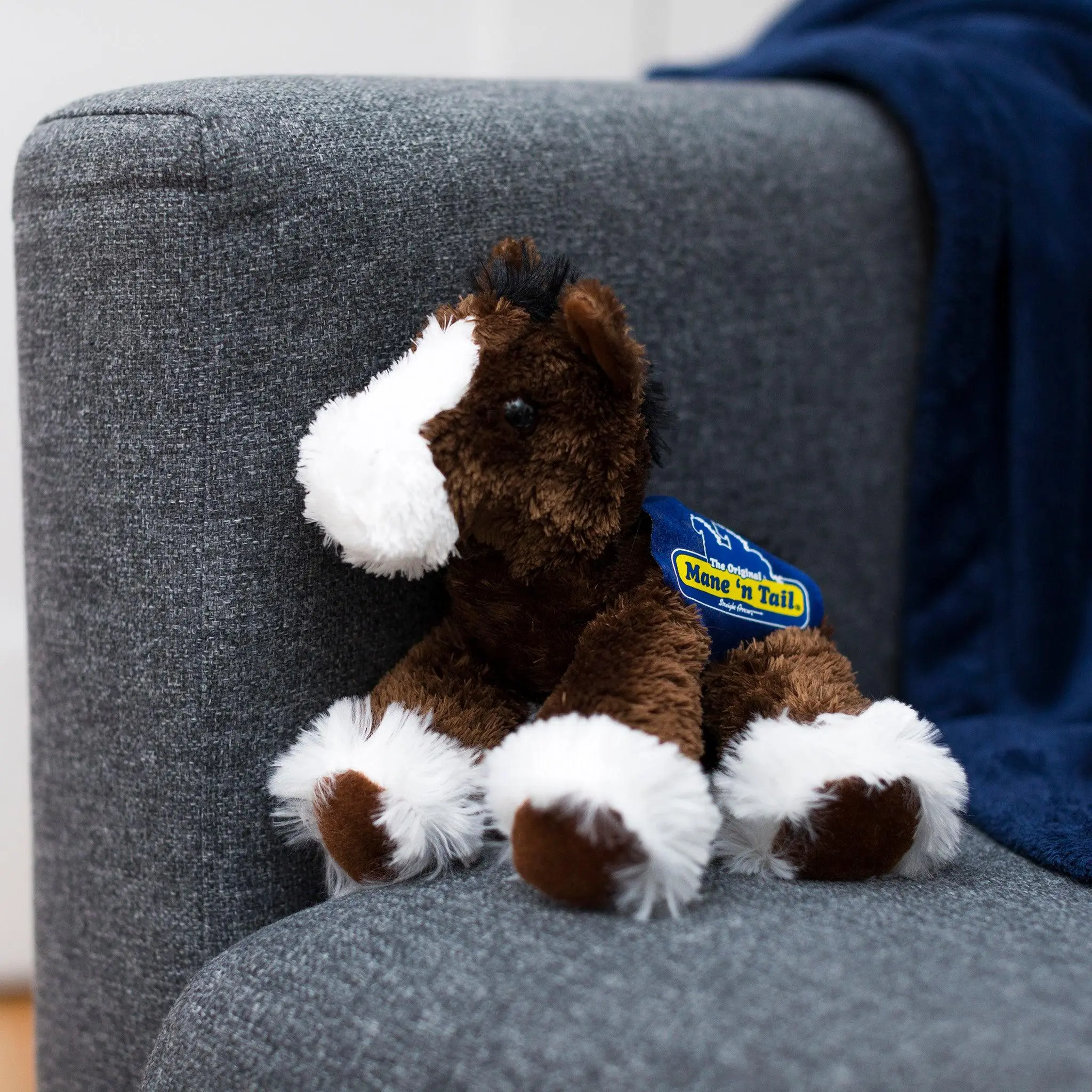 Soft 8" Clydesdale plushie. Has a dark brown coat with a white face and "socks". Bold, cuddly and absolutely adorable. Made of new materials containing polyester fibers and plastic pellets. Surface washable.