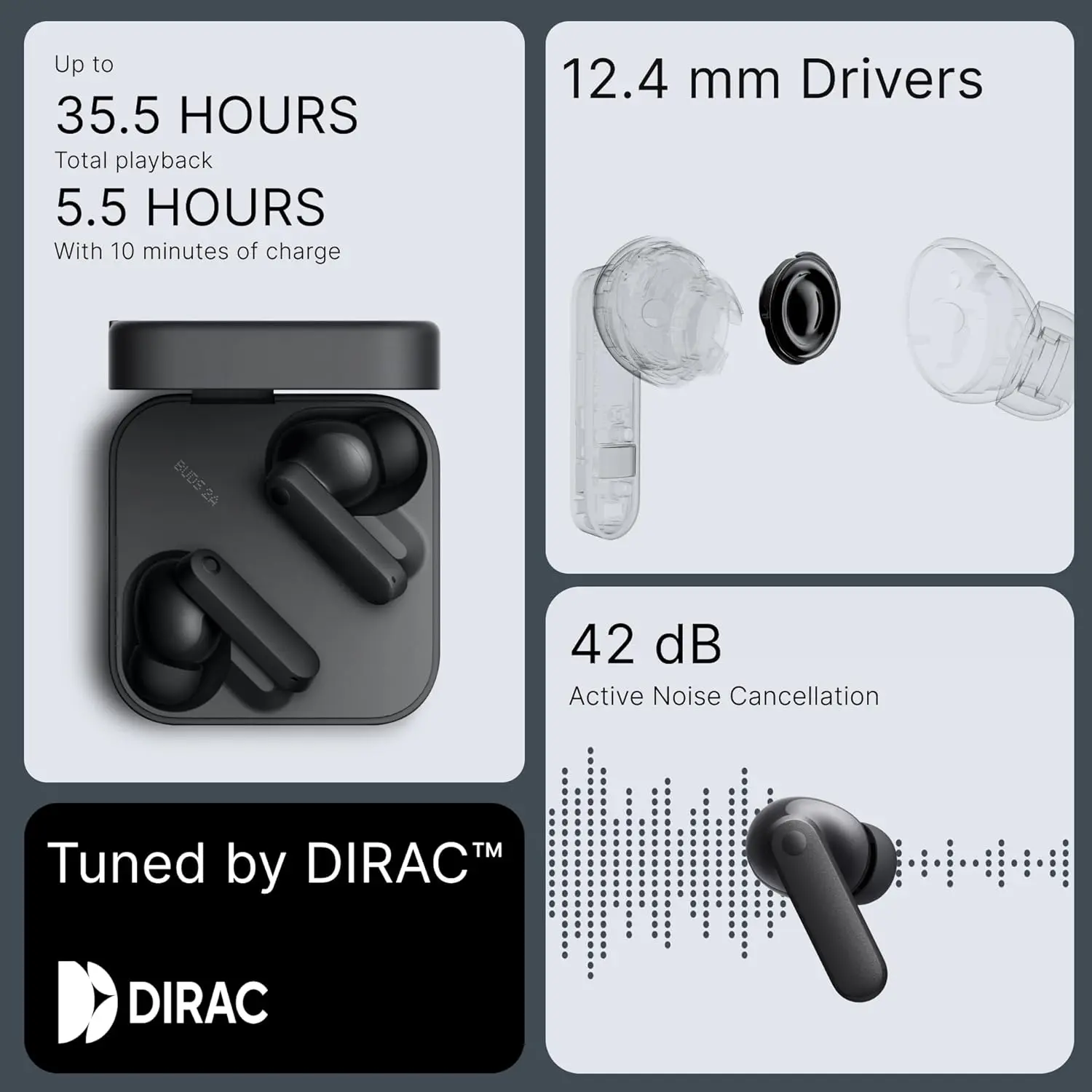 Elevate your audio experience with the CMF Buds 2a. These earbuds feature 12.4mm Bio-fiber drivers and Dirac sound tuning for thunderous bass. Ultra Bass Technology 2.0 adapts sound to your environment. Experience 42dB Hybrid Active Noise Cancellation, silencing frequencies up to 2900Hz. Switch to Transparency Mode for situational awareness.