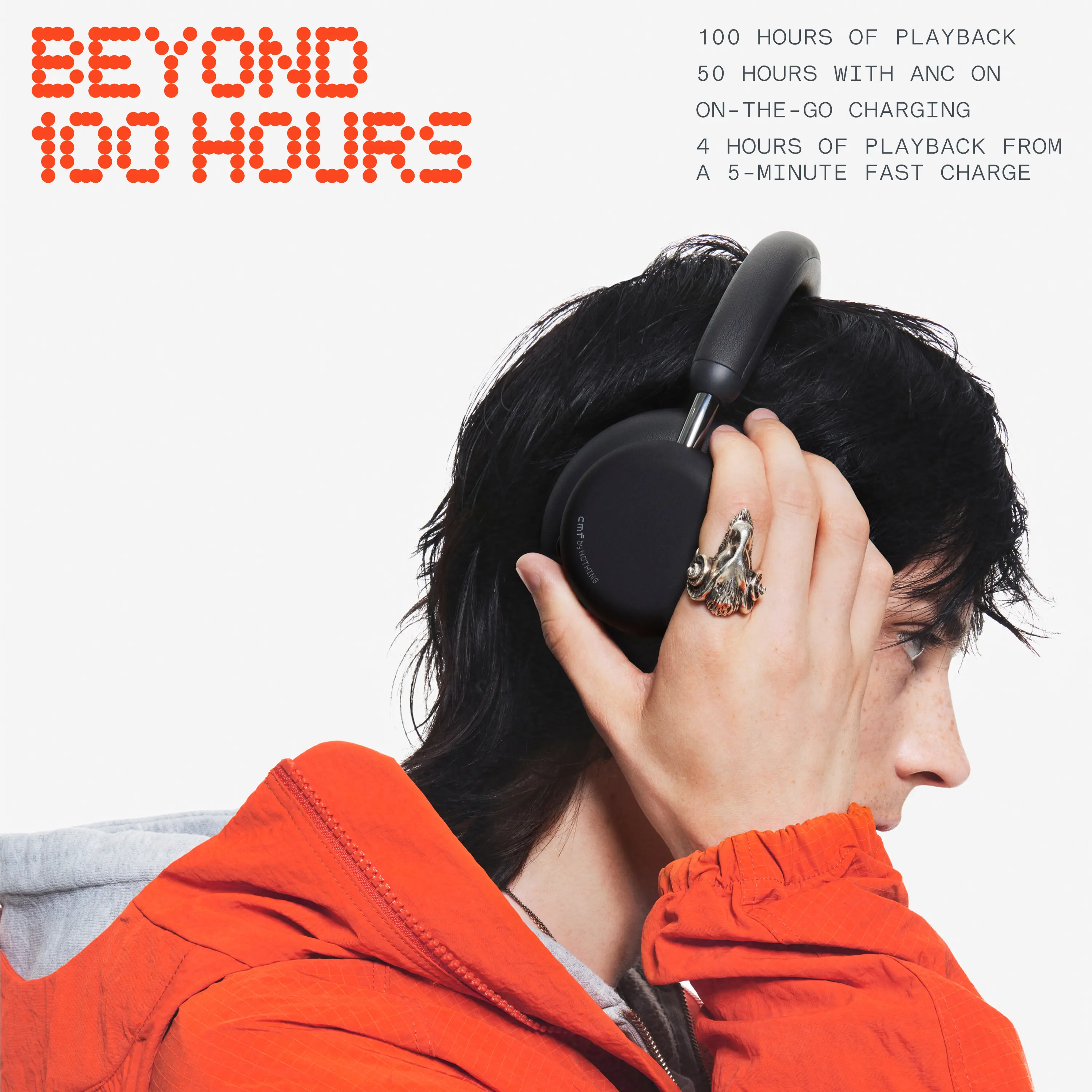 Up to 100 hours playback (ANC off) / 50 hours with ANC on. Plus 5 mins charge = 5 hours playtime. Stay connected longer.