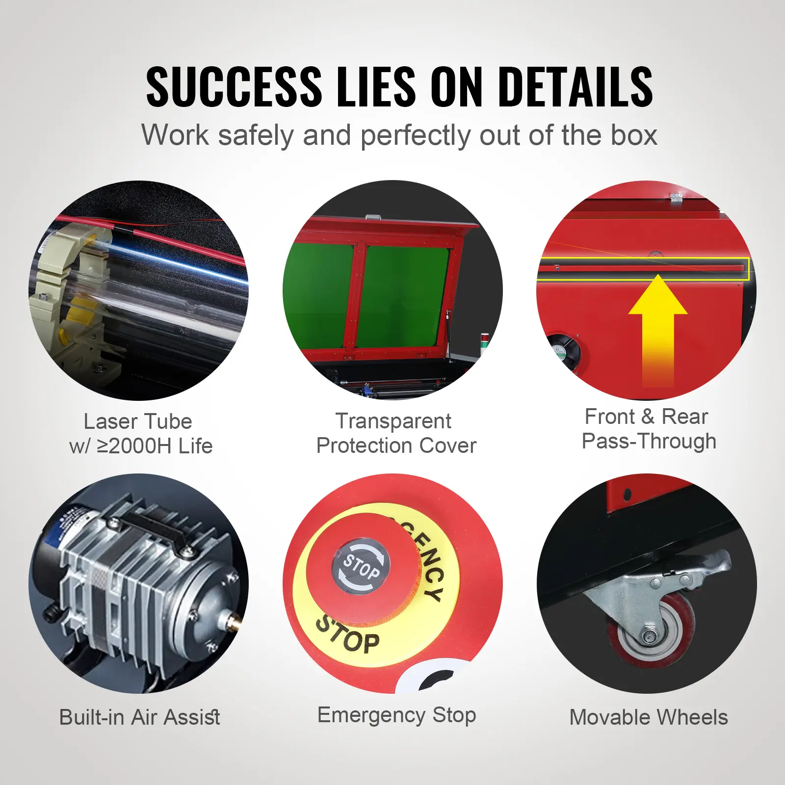 • Secure & Easy Operation: Work with peace of mind! The transparent window is tinted for eye protection, allowing you to monitor engraving progress at any time. The power automatically cuts off when opened. An emergency stop is standing by should anything go sideways. Our CO₂ laser machine also has an air assist to blow away all smoke, dust, and sparks. Movable wheels keep everything rolling smoothly.