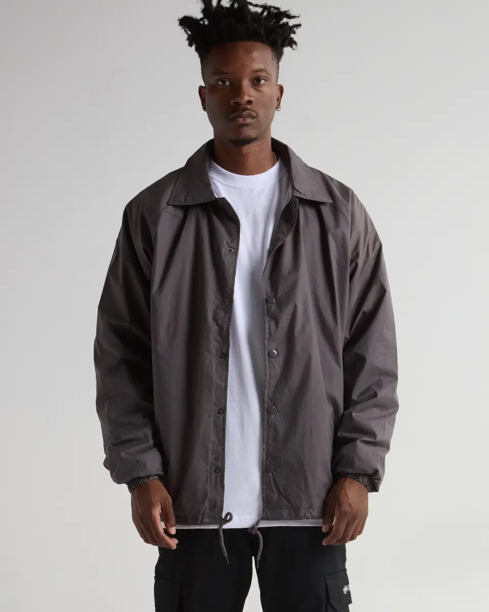 Elevate your style with this Coach Jacket, designed for comfort and functionality. It features a padded collar and adjustable drawstring at the bottom for a customized fit. The raglan cut sleeves ensure maximum mobility. This jacket is perfect for those who value both style and practicality.