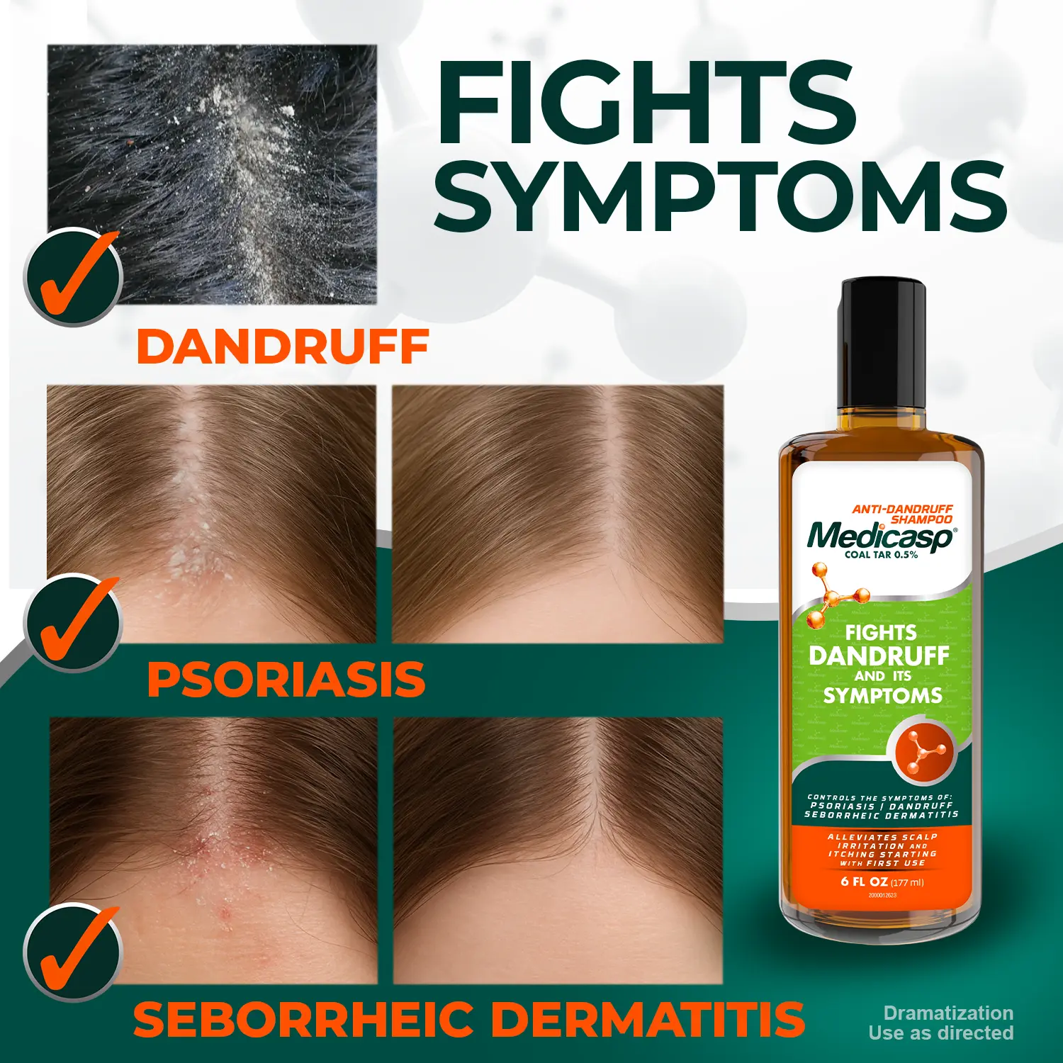 ·Medicasp Shampoo Results: Use twice a week to control and fight the symptoms of Dandruff, Seborrheic Dermatitis and Scalp Psoriasis and help prevent the recurrence of scalp itching, redness and irritation associated with dandruff flakingfeatures 0.5 percent coal tar