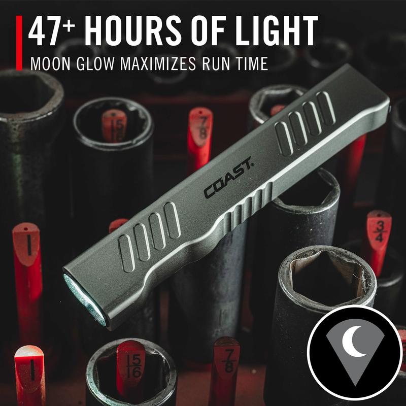 Lead the way. With its flat-shaped, all-aluminum frame, the rechargeable SLAYER with Laser feels great in hand, slides effortlessly in and out of pockets, and secures when stowed with a removable metal clip. The Dual Optic lighting system shines a multi-mode spot beam or a red laser, each independently controlled. Use the forward power button to cycle the spot beam through four modes (high, low, Turbo, and MoonGlow™) and the rear button to switch the laser on and off. MoonGlow™, COAST’s low-energy eco beam, is ideal for blackout conditions and when extended runtimes are critical. This economy mode draws so little power when engaged that the flashlight can run continuously for 47 hours. At the other end of the output range, Turbo mode shines 1000 lumens at 105 meters (344 feet). The laser is perfect for calling attention to details on construction sites, leading group discussions, and much more. Two magnets at the front and back of the handle provide a hands-free lighting mount. During use, the charge level indicator ensures you always know when you need to plug back in—the integrated ZITHION™ rechargeable battery powers back up fast via the USB-C port, in just two hours. Constructed of top-grade materials and fit for the toughest work, the SLAYER  with Red is rated IP67 dust resistant and waterproof and backed by the COAST lifetime warranty.