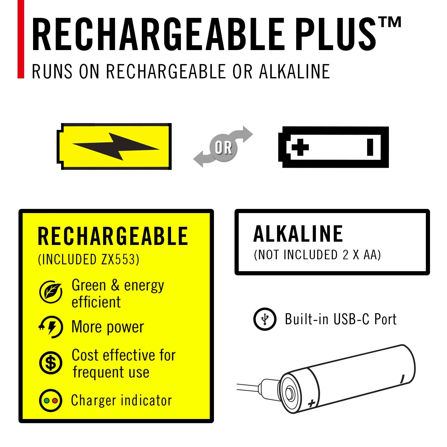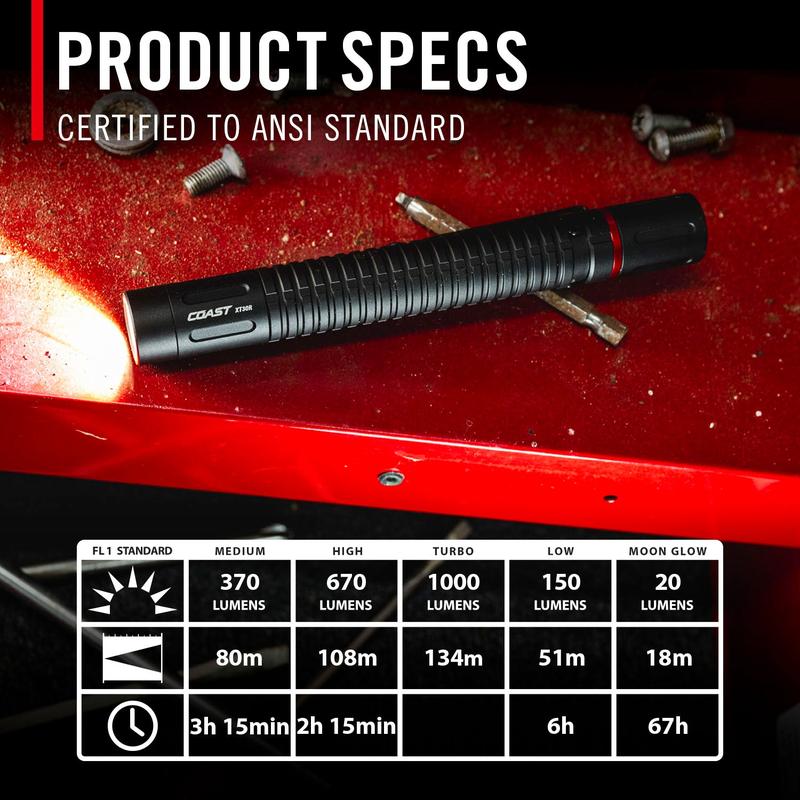 Go bright all day with high-performance pen lighting. Built to deliver up to 1000 lumens and long run times, the XT30R features five light modes—medium, high, Turbo, low, and MoonGlow—supported by an oversized rechargeable battery. Whether working in an auto shop or electrical panel, this flashlight’s PURE BEAM optic delivers any required beam shape. Use the TWIST FOCUS to seamlessly transition from Ultra View Flood Beam to BULLS-EYE Spot Beam—anywhere between. And when you need both hands, hold your light in your mouth more efficiently—using our specially designed rubber bite cap that snugs onto the end of the light and protects your teeth. The flashlight’s slim format makes the XT30R easy to tuck into your tool bag or carry by hand, and its rugged build rises to the rigorous demands of everyday use. When not in use, stow the flashlight securely with the pocket clip. Powered by the COAST Rechargeable Plus system, this flashlight runs up to 67 hours on its included rechargeable ZITHION battery or two AA alkaline batteries (purchased separately). Recharge the ZITHION battery via the flashlight’s built-in USB-C port. Constructed of top-grade materials, the XT30R is rated IP54 water-resistant and dust-resistant, backed by the COAST lifetime warranty.