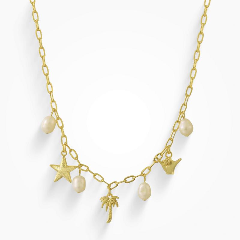 Bring vacation vibes anywhere you go with this playful gold charm necklace. Featuring starfish, palm tree, and bird charms paired with dainty pearls, it's the perfect mix of coastal chic and effortless elegance. Ideal for sunny days, beach getaways, or layering with your favorite summer pieces.