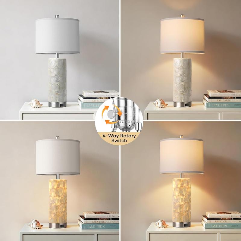 Coastal Table Lamps for Living Room Set of 2, Bedside Lamps with Night Light, USB A+C Ports, 4-Way Rotary Switch, Seashell Nightstand Lamps for Bedroom and Home Office(LED Bulbs Included)