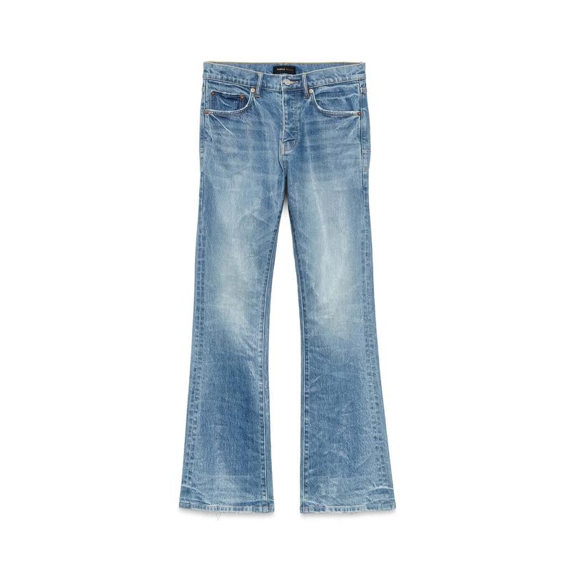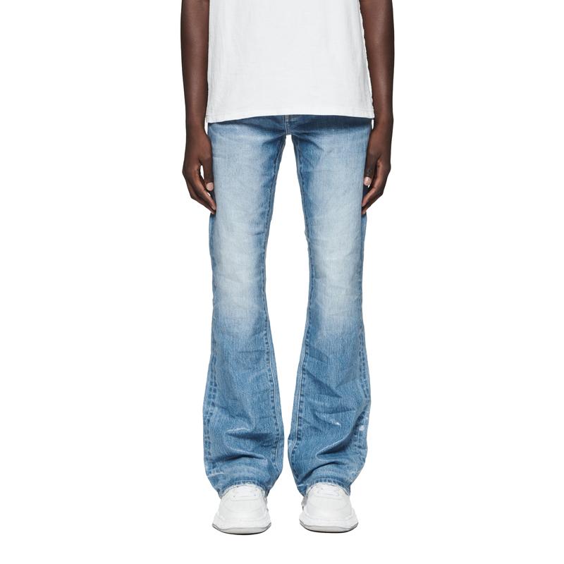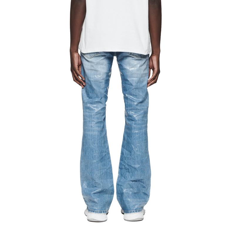 Crafted from premium light indigo stretch denim with a coated finish, this faded low rise flare is detailed with reinforced belt loops and hidden back-pocket rivets for extra durability and chambray lining for a more comfortable fit.