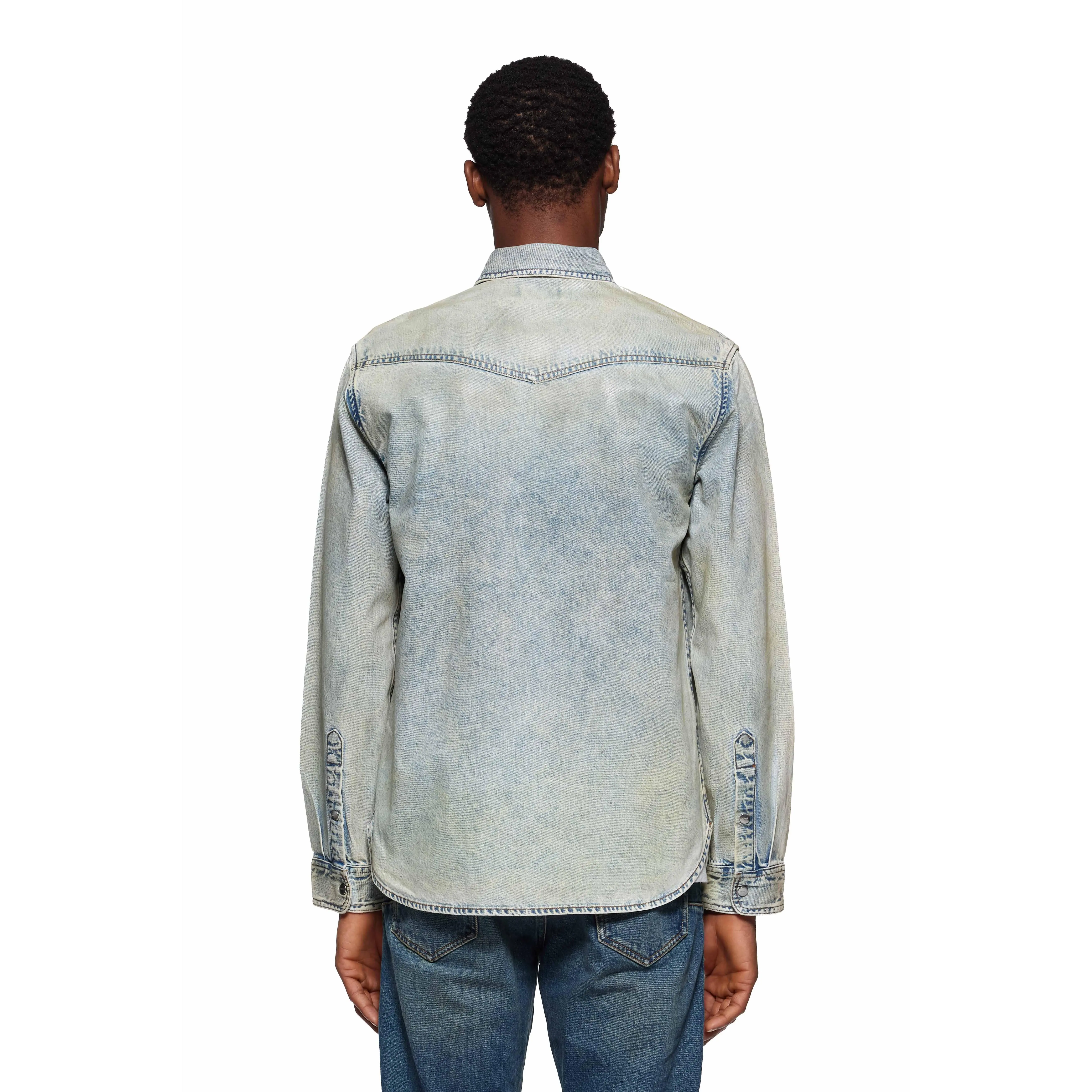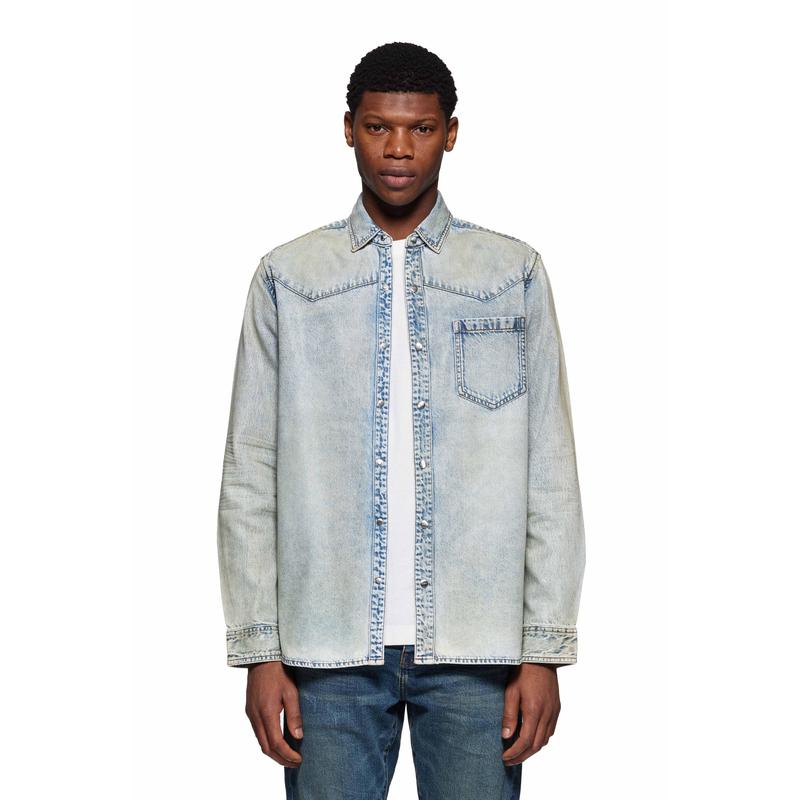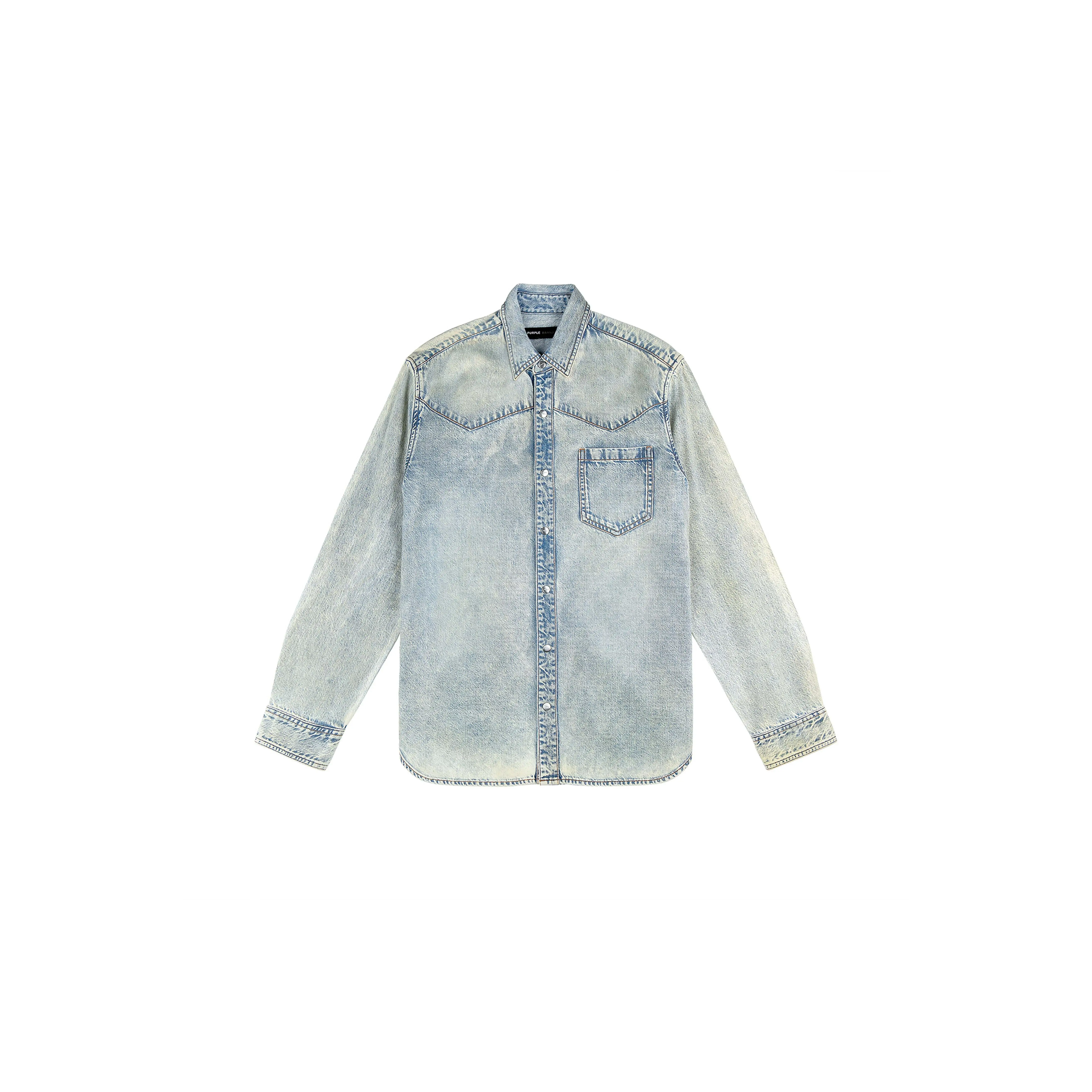 This regular fit shirt incorporates details from both western and trucker styles. It comes in a light indigo wash with coating and a pocket at the chest.