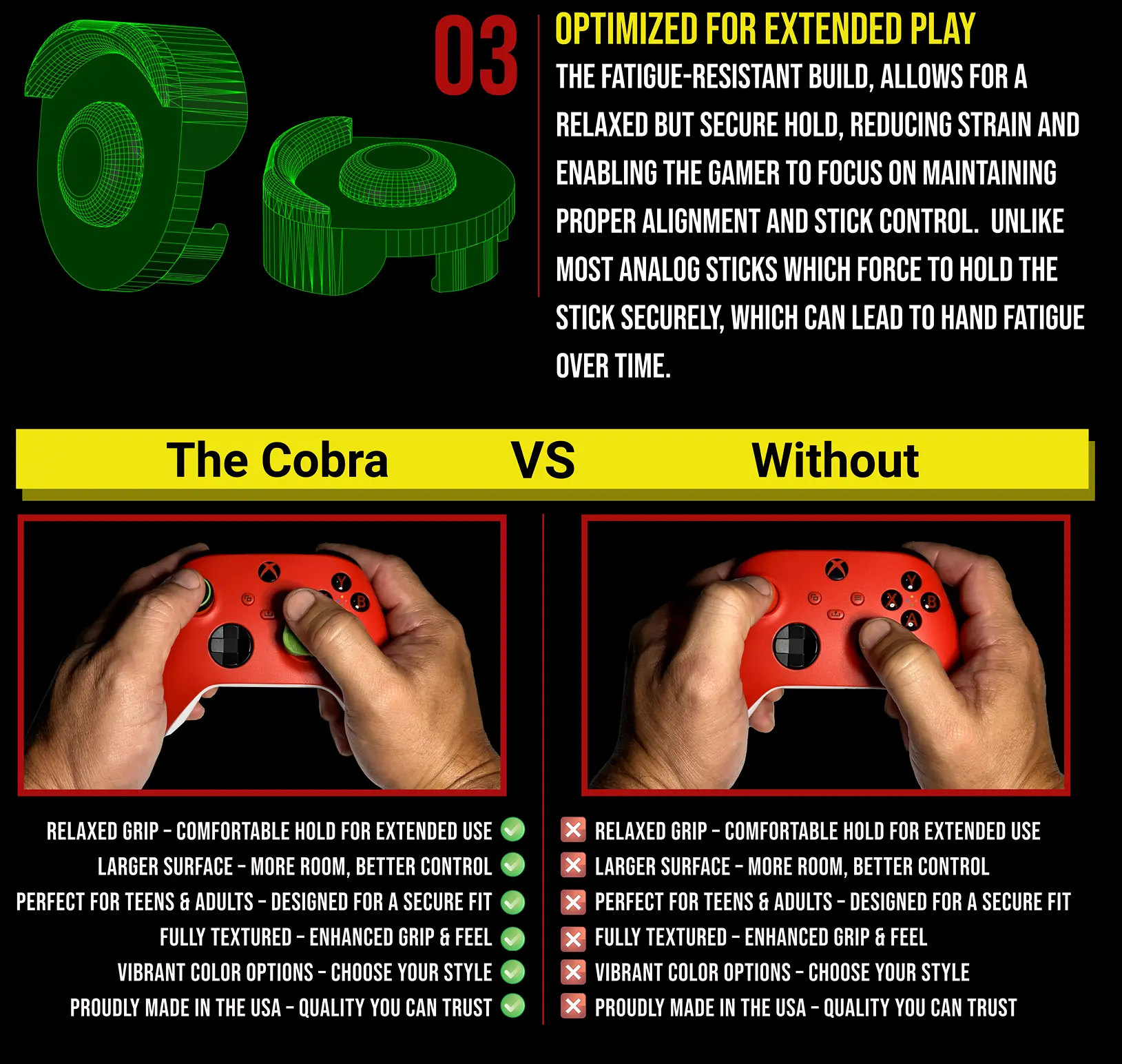 Add to Cart Now & Unlock Precision with The Cobra Analog Stick Attachment. Level up your gameplay with flawless recoil control and pinpoint accuracy. Perfect your aim in FPS games, keep your shots on target, and gain better control over hip fire, even in intense firefights. Your controller will never let you down.
