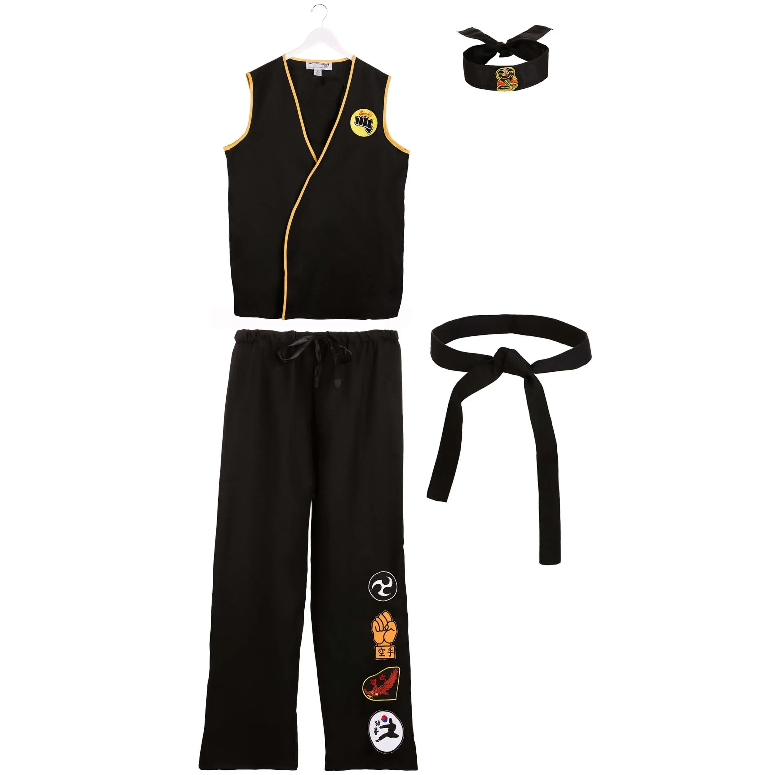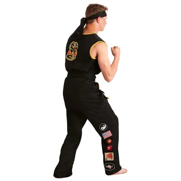 No matter what problems the leader of the Cobra Kai dojo might have, we're pretty sure that you can turn things around. Start by jumping into this officially licensed costume from Karate Kid. This Cobra Kai look was put together by our in-house design team and ensures you'll feel like you took a flying kick right out of the 1984 film. Start with your wrap-around shirt that features the dojo's patches on the front and back. The matching pants have an elastic waist and several patches on the leg to show how successful the dojo has been. Finish off your authentic look with the headband and karate belt and it'll be your time to shine.