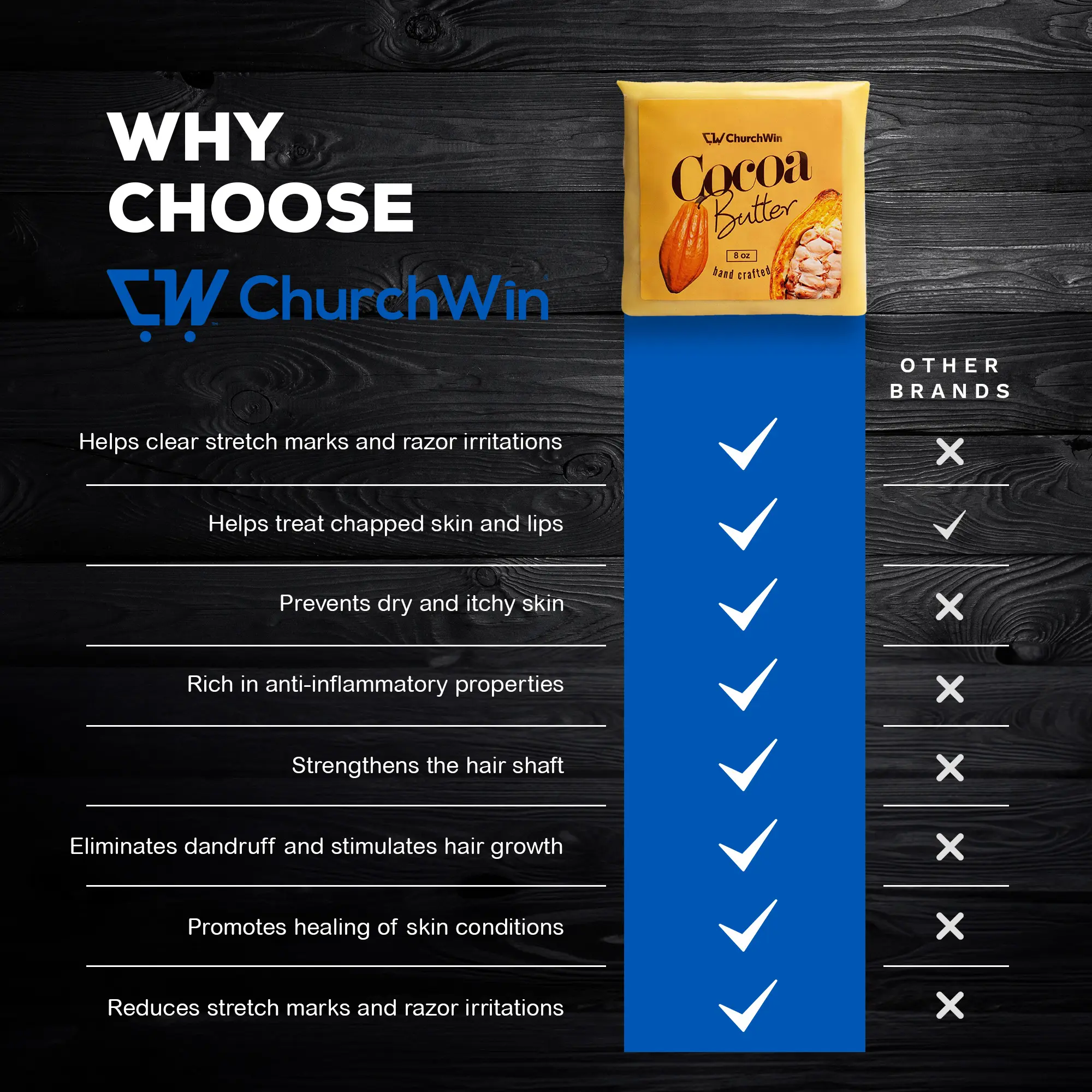 Experience the natural benefits of ChurchWin Natural Cocoa Butter, a key ingredient in skincare and beauty products. Perfect for enhancing your skin, hair, and DIY projects.