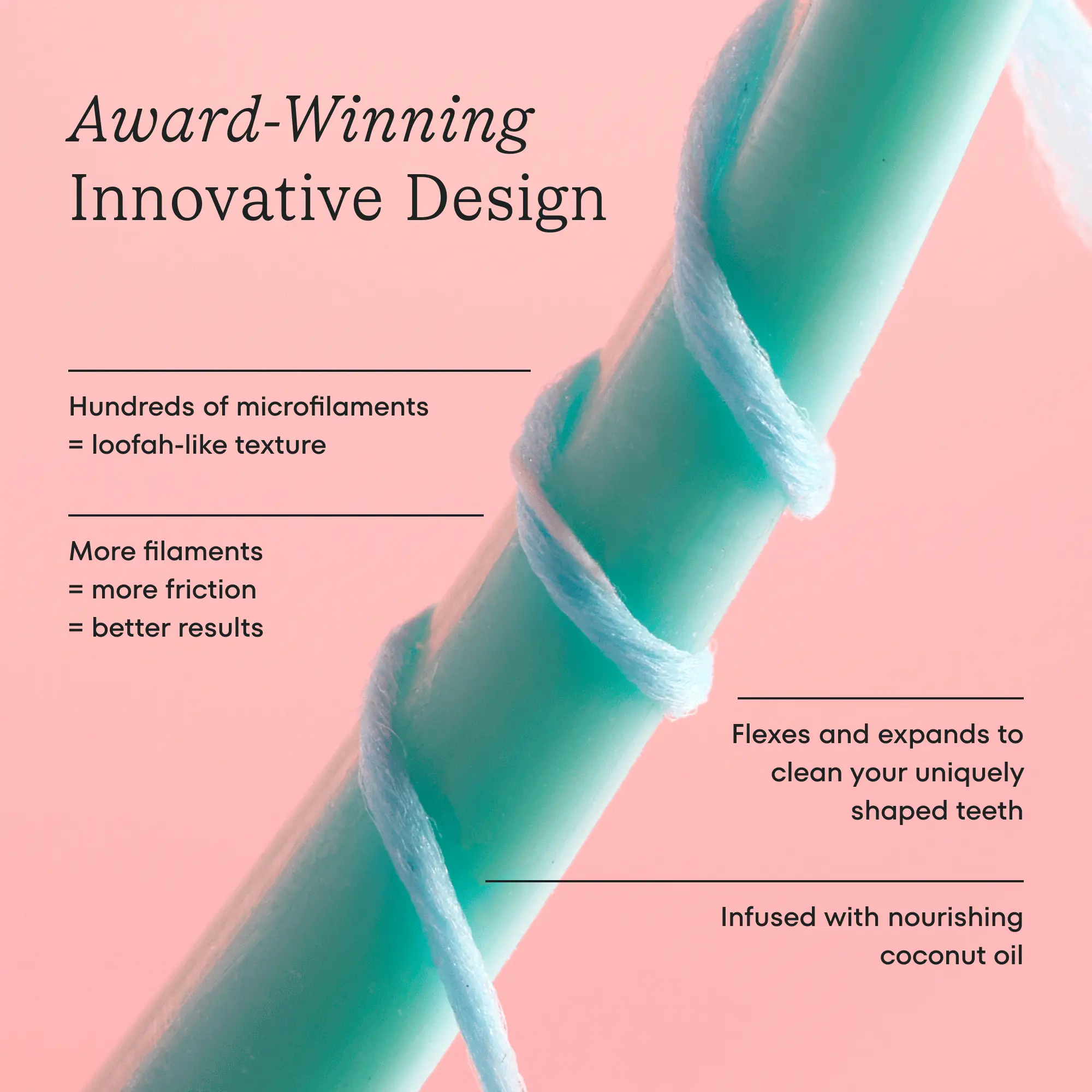 ·Super-cleansing design. 500+ ultra-durable interwoven filaments expand to pull away plaque from every surface area.