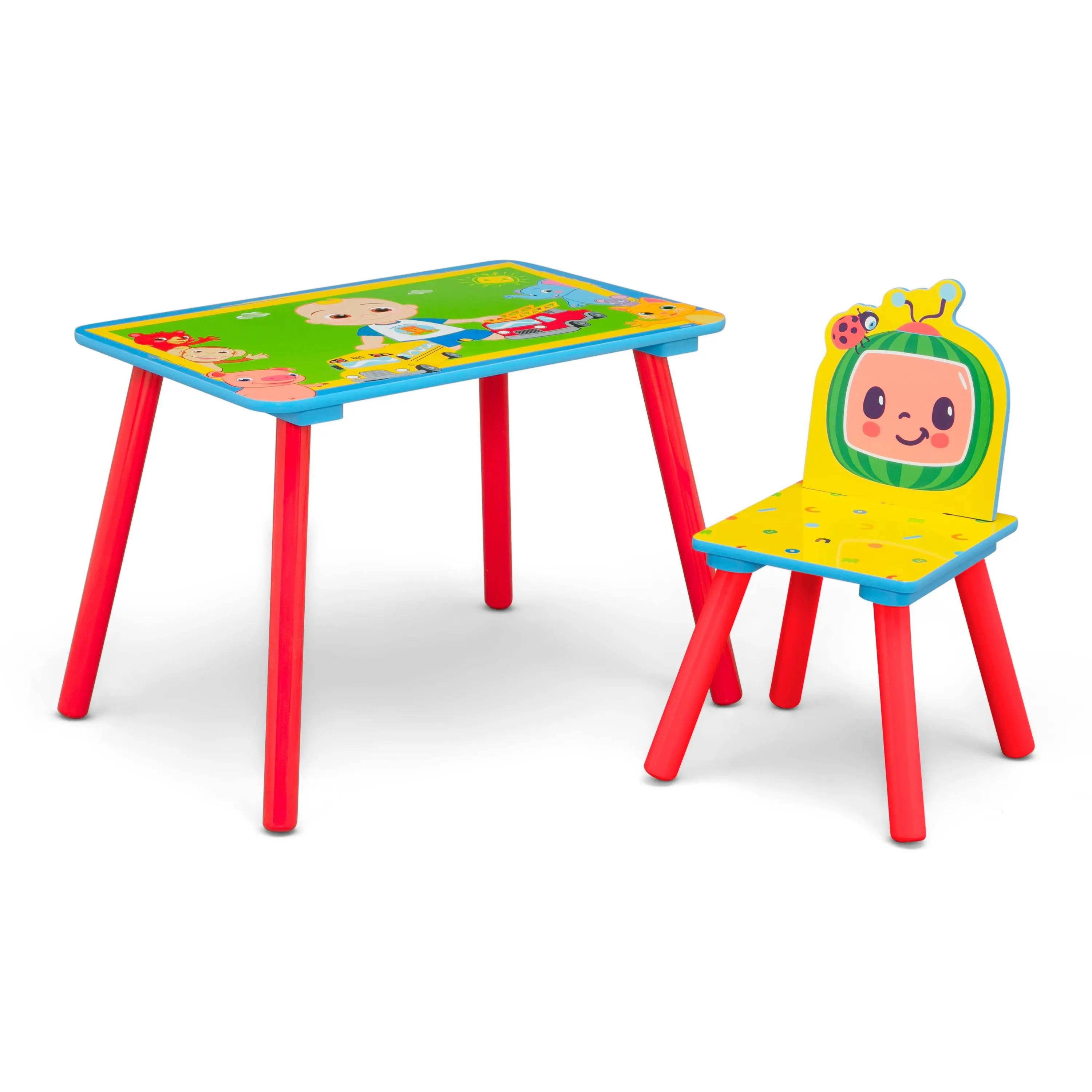 Playtime just got so much cooler with the CoComleon 3-Piece Toddler Playroom Set by Delta Children. A versatile set that provides both seating and storage, it includes a wooden play table with a chair and a toy box. The wooden play table and chair are the perfect kid-size height and feature bold CoComelon graphics. The toy box features a retractable top and spacious interior to hold books, blocks, and more. Built from sturdy materials, these pieces will standup to years of playtime.