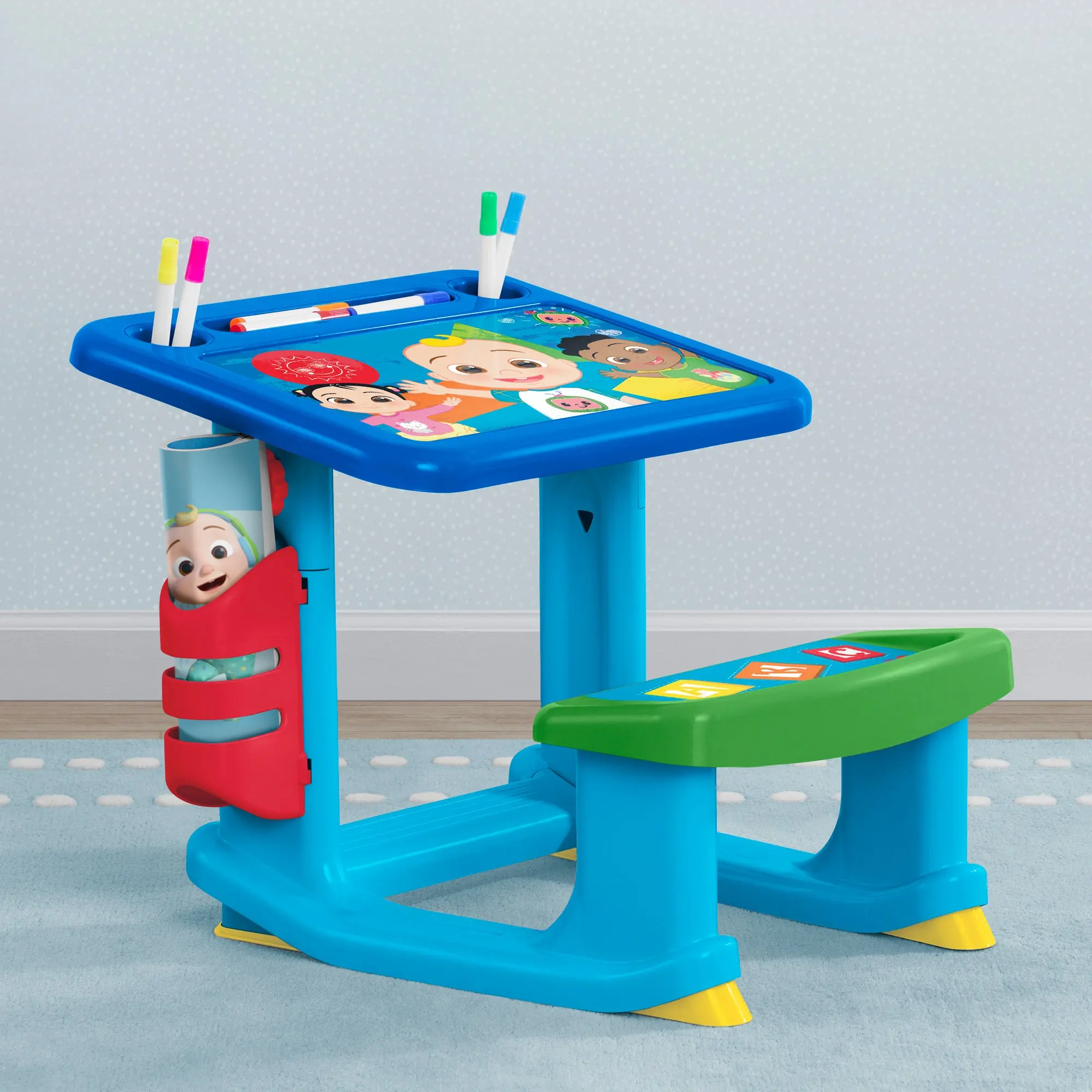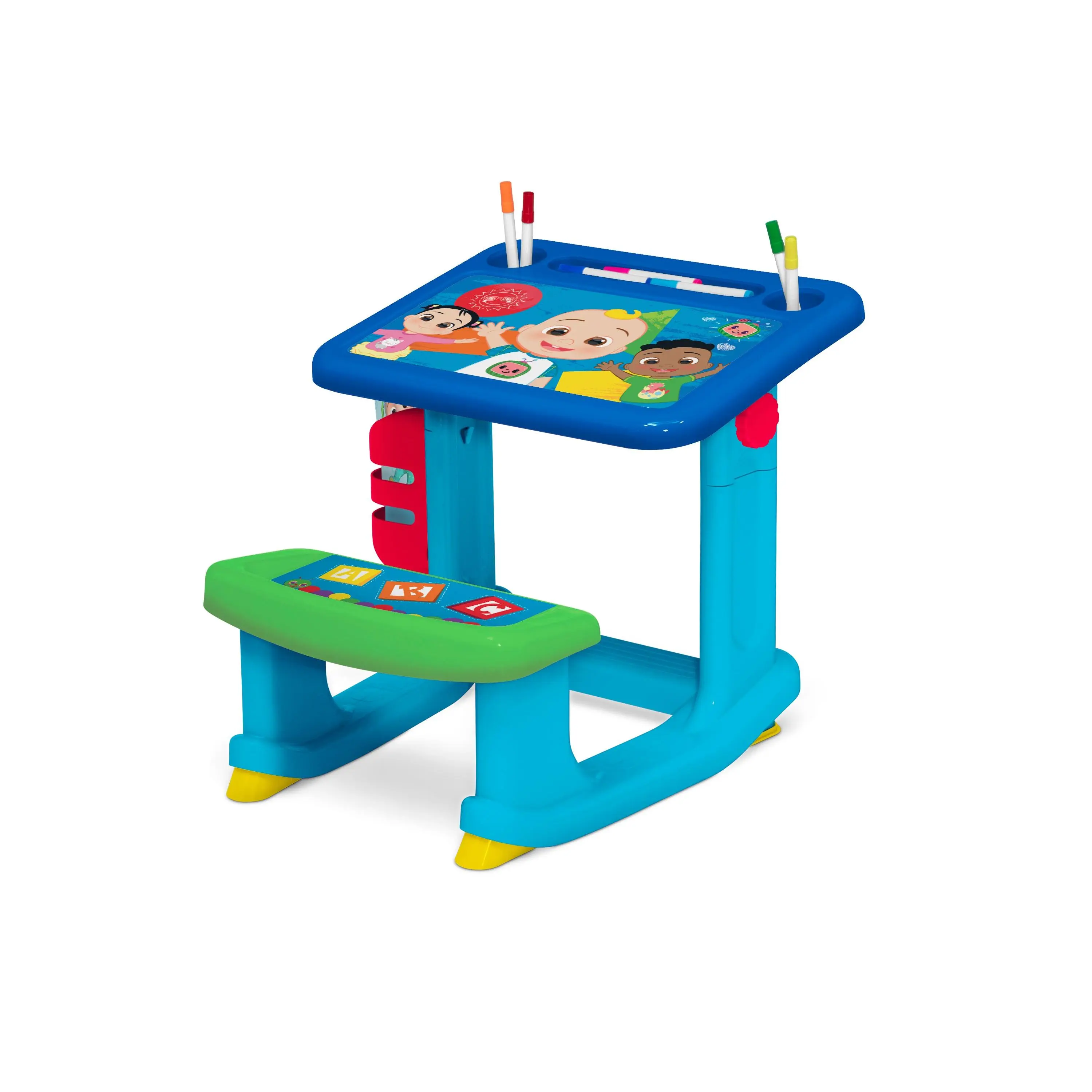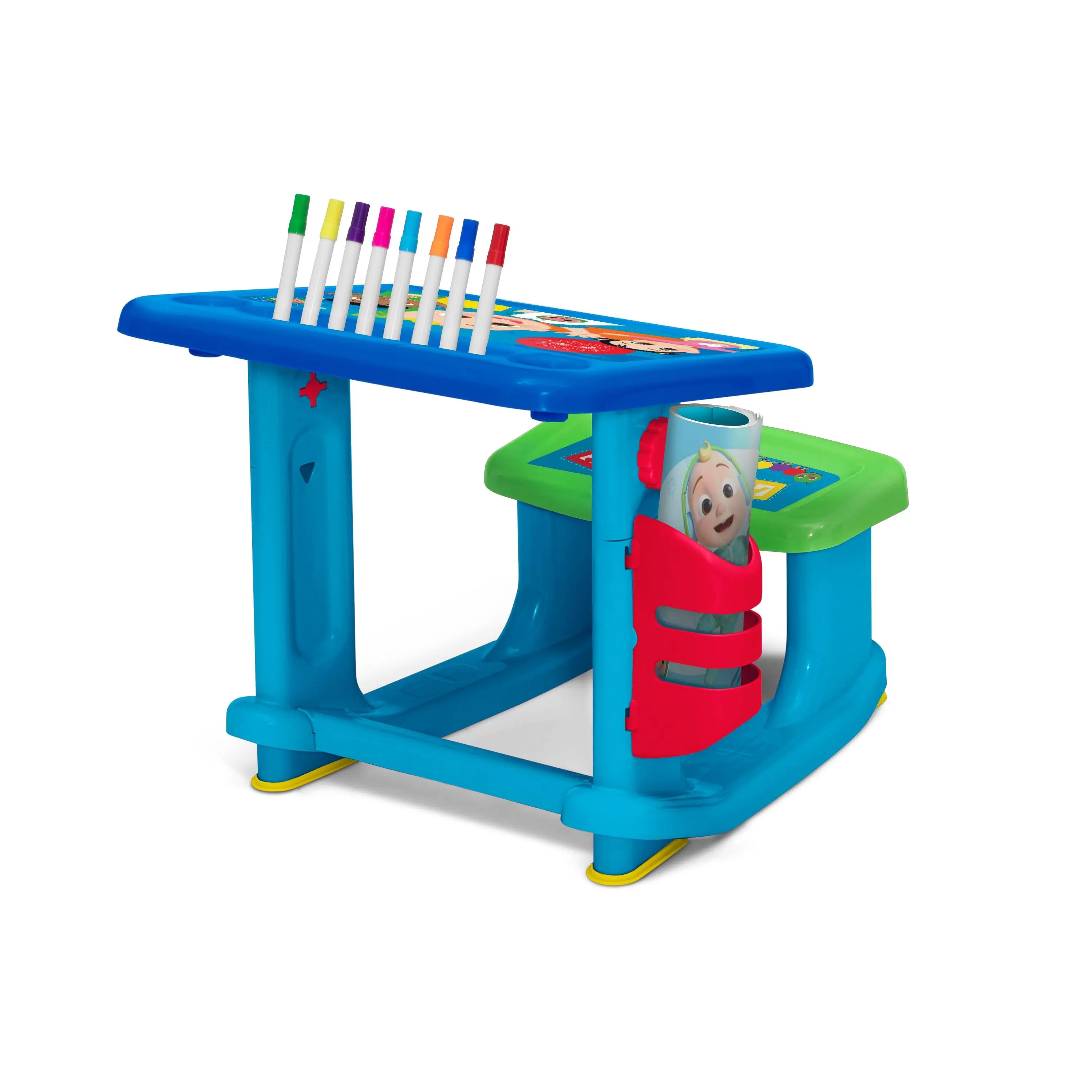 Every day is a good day to learn and play alongside JJ with this CoComelon Draw and Play Desk by Delta Children! A colorful spot to paint or draw, this sturdy art desk with bold CoComleon graphics, an included 10-pack of markers and 4 coloring pages helps inspire creative play. Tons of storage space for the included markers and coloring pages makes tidying up easy. The desk’s built-in bench seat and footrest ensure your little one stays comfy while they play. Recommended for ages 2 years and up.