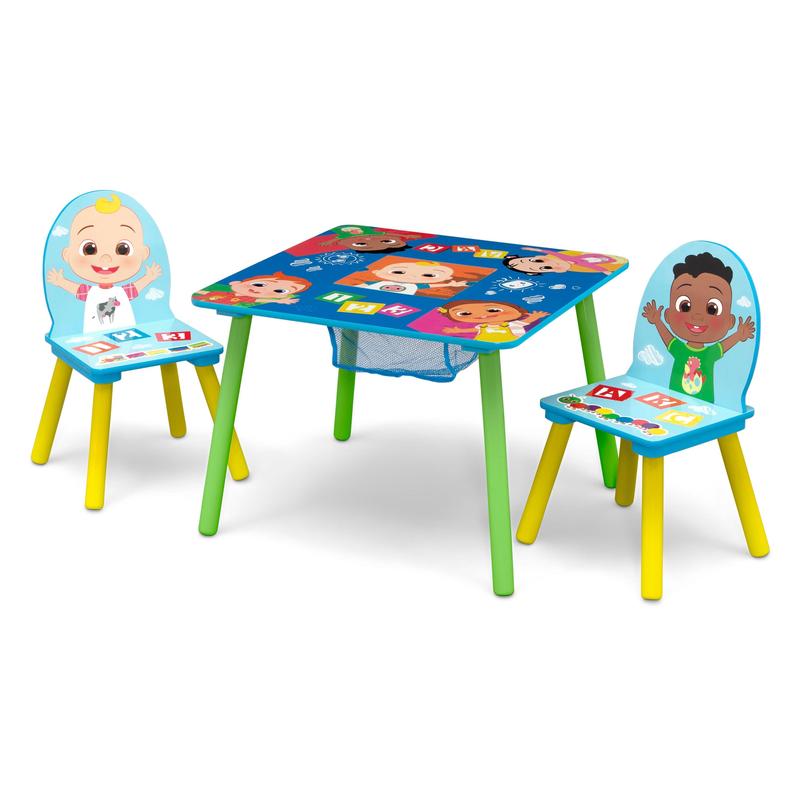 Make everyday activities more fun with this CoComelon Kids Table and Chair Set with Storage by Delta Children that features colorful graphics of baby JJ and other CoComelon characters. This kids table and chair set features a table and two chairs, designed at the perfect kid-sized height, making it ideal for snack time, playtime or homework. Plus, a built-in storage compartment at the center of the table provides the perfect space to keep art supplies.