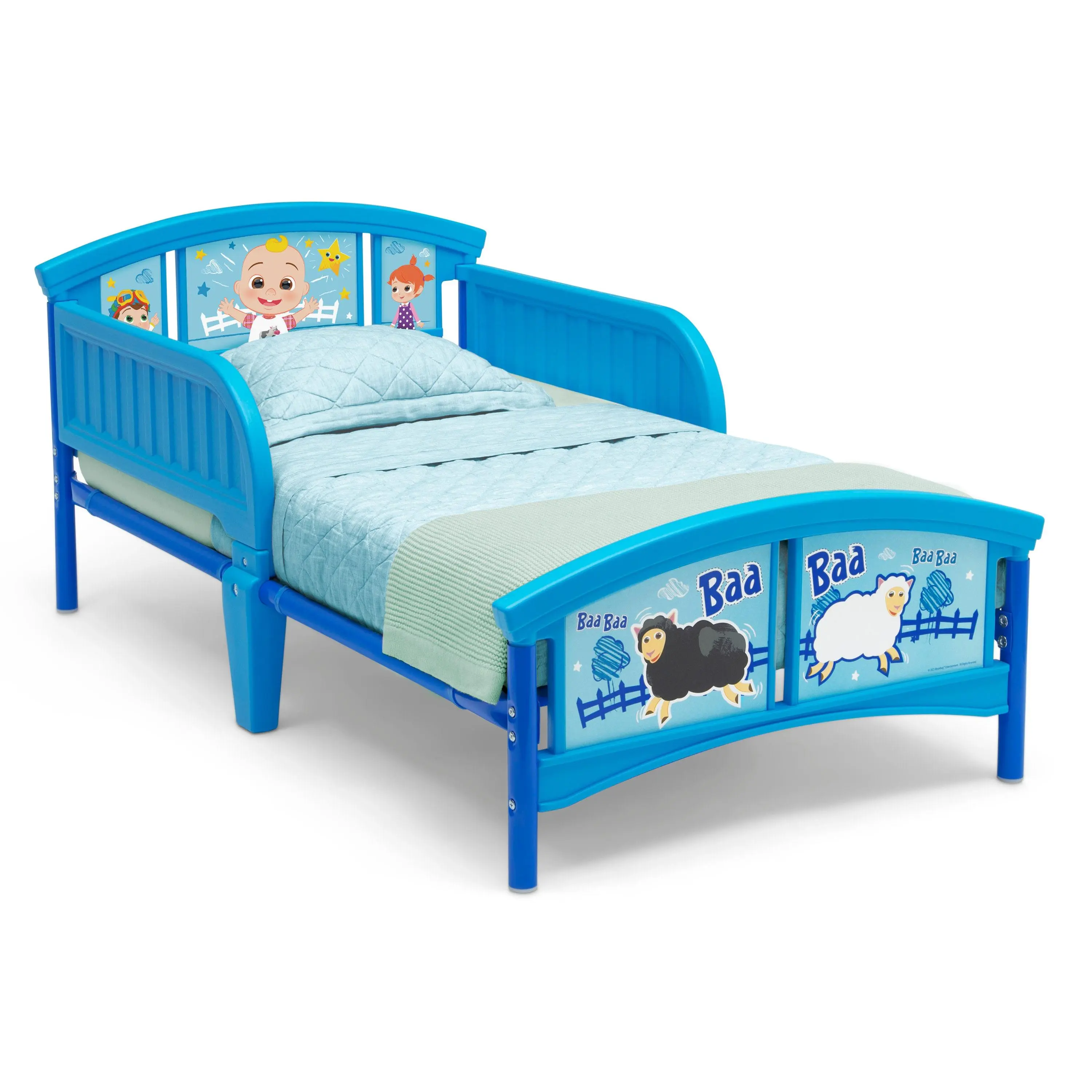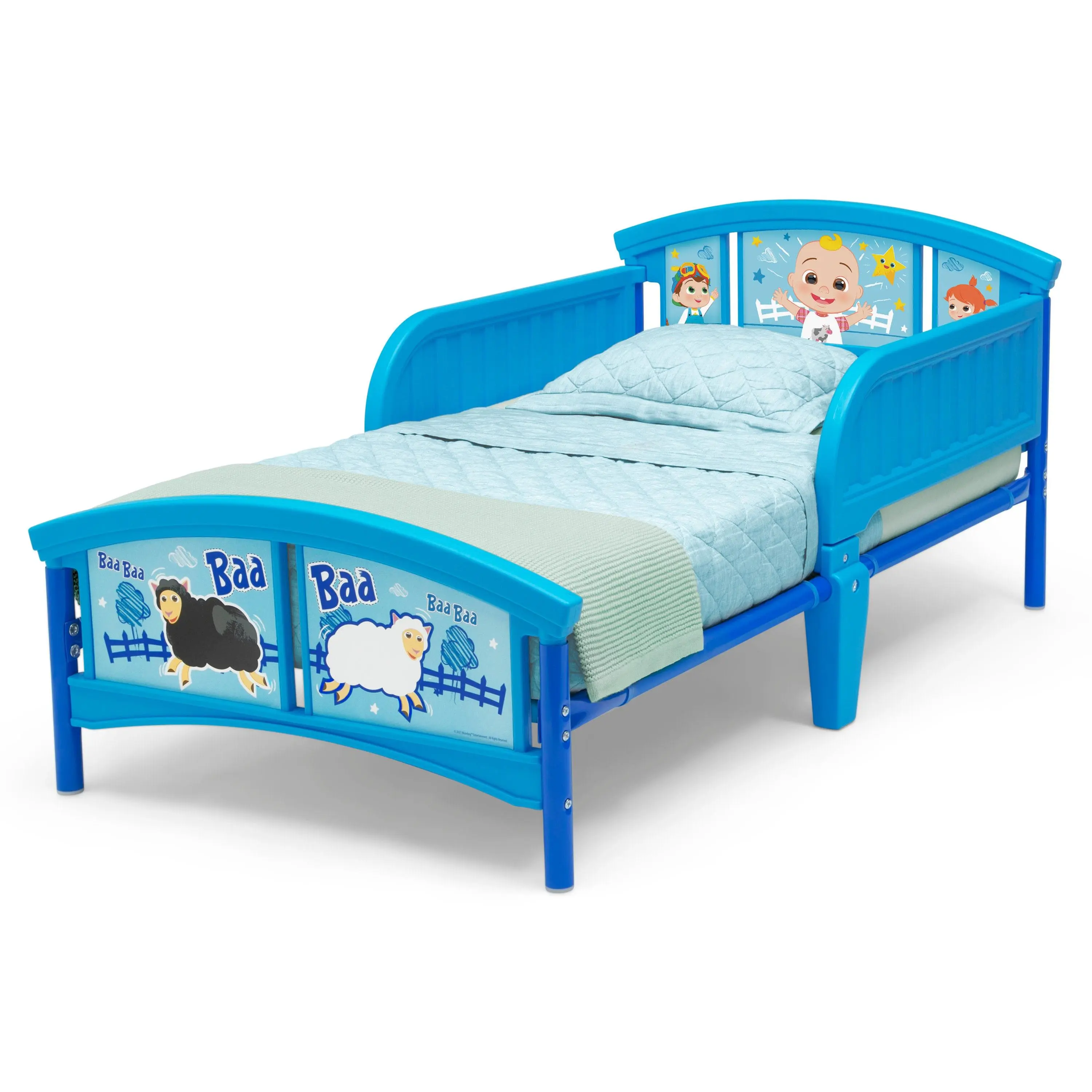 JJ wants a bed like big kids have, and so will your little one when they see this CoComelon Plastic Toddler Bed by Delta Children. Featuring colorful decals of JJ and friends, this kids’ toddler bed will make a splash by inspiring a wave of sweet dreams. The bed’s low mattress height and attached guardrails make it the best option for your child’s first big-kid bed, giving them the independence they crave while keeping them safe throughout the night. Get this toddler bed today and bring home the magic of CoComelon! Bedding and mattress not included.