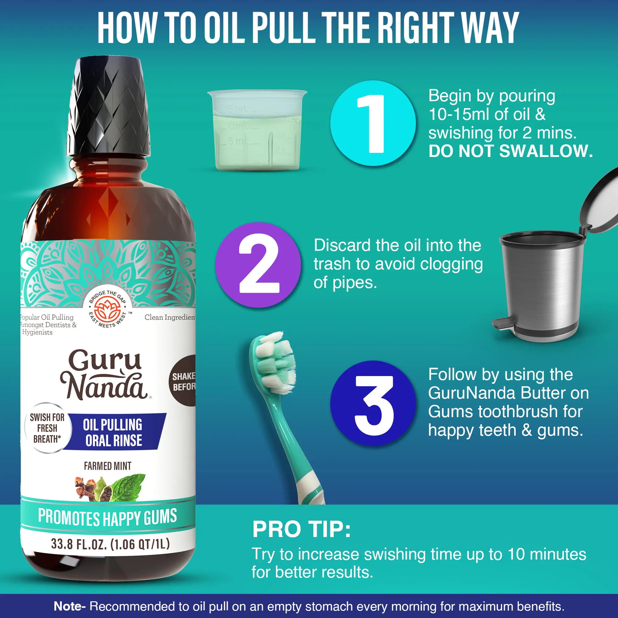 Pour 10-15ml of pulling oil into the provided measuring cup. Swish for 2 minutes, & gradually increase to 10 minutes. Discard the oil in the trash to avoid clogging pipes. Use on an empty stomach every morning for optimal results.