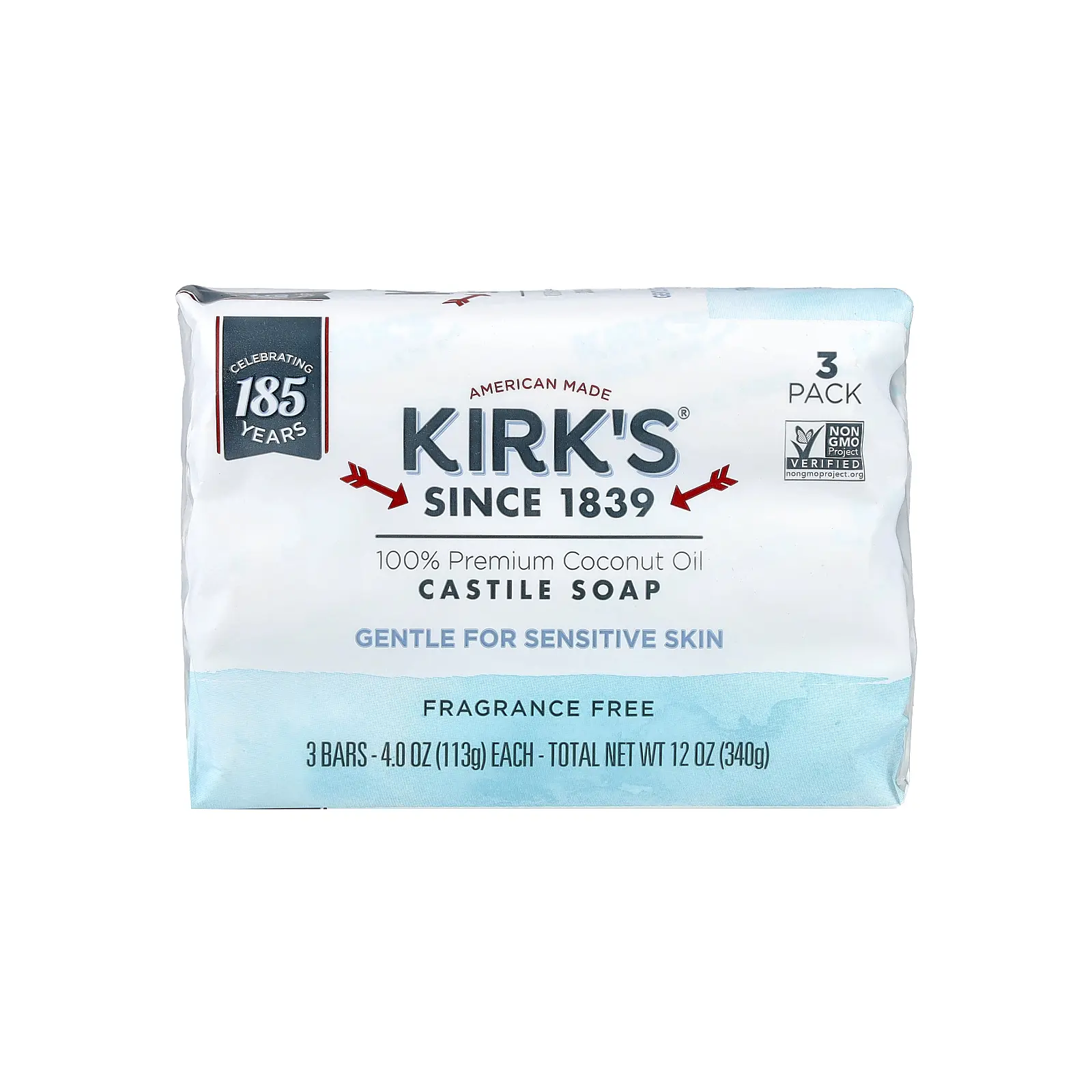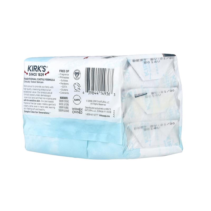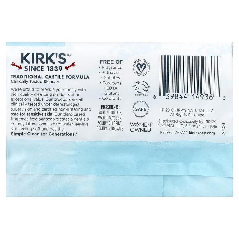 Kirk's 100% Premium Coconut Oil Castile Bar Soap, Fragrance Free, 3 Bars, 4 oz (113 g) Each
