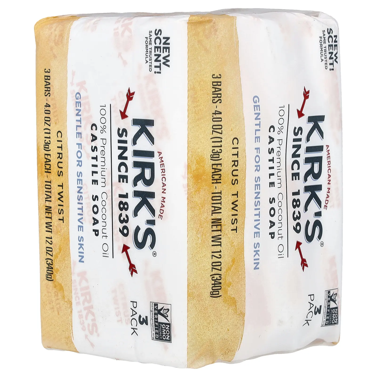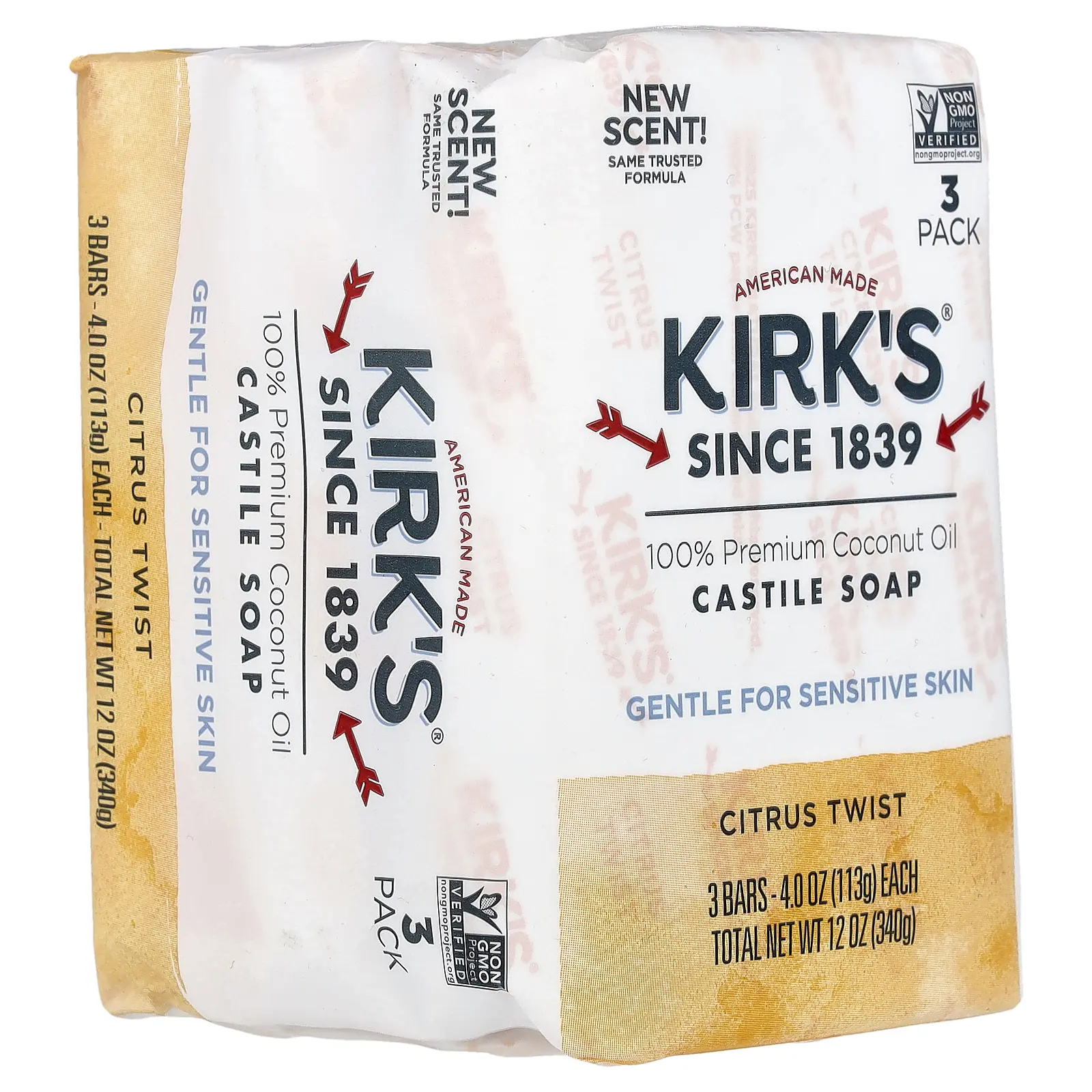 Kirk's 100% Premium Coconut Oil Castile Bar Soap, Citrus Twist, 3 Bars, 4 oz (113 g) Each