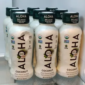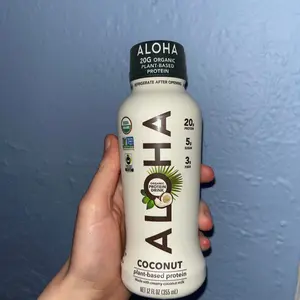 Aloha, coconut plant protein drink. Very nice flavor of coconut. A little plant-based protein aftertaste at the end, but still really tasty. Would buy again.