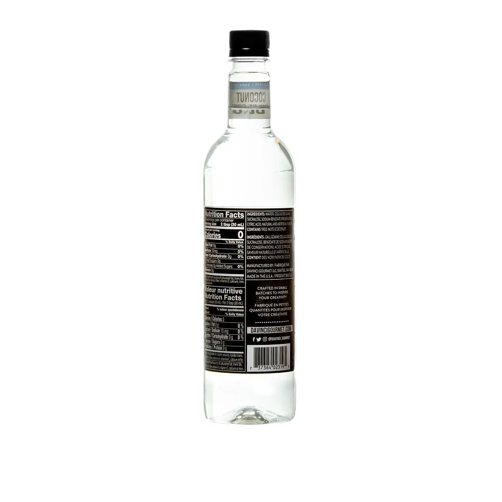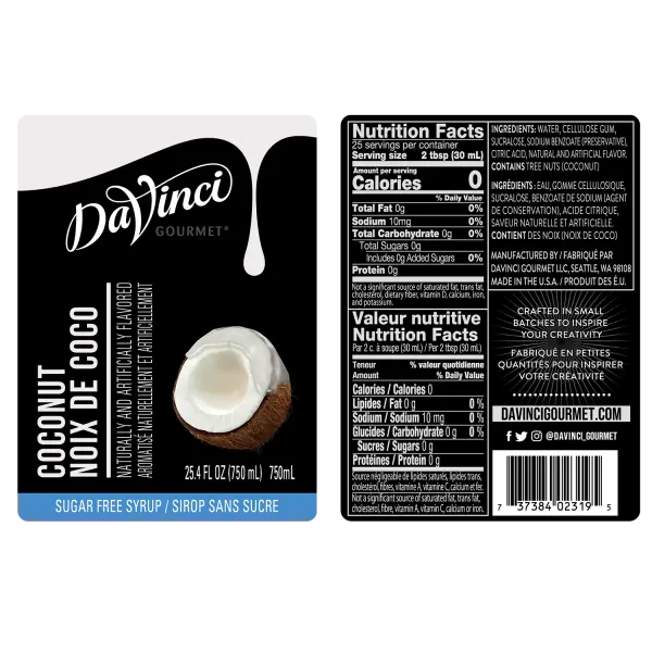 Creamy, nutty coconut flavor is infused in every drop of this deliciously fruity Sugar Free syrup from DaVinci Gourmet. Drizzle it into coffee, tea, cocktails, mocktails and desserts for sweet coconut flavor and aroma without the sugar and calories. We craft our DaVinci Gourmet Sugar Free Syrups with delicious ingredients for incomparable taste. You can use our Sugar Free syrups in hot, cold and blended beverages, as well as your favorite culinary creations, whether you're at home or at the coffee shop.