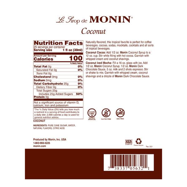 Nutritious coconut and its milk are widely used in both beverages and foods; this lightly sweet yet versatile flavor pairs well with sweet, bitter and salty flavors. Monin Coconut Syrup provides pure coconut flavor to all your tropical-inspired beverages. Made with select ingredients and pure cane sugar, Monin Coconut Syrup is a highly concentrated, authentic flavoring offering exceptional versatility for creating specialty beverages.