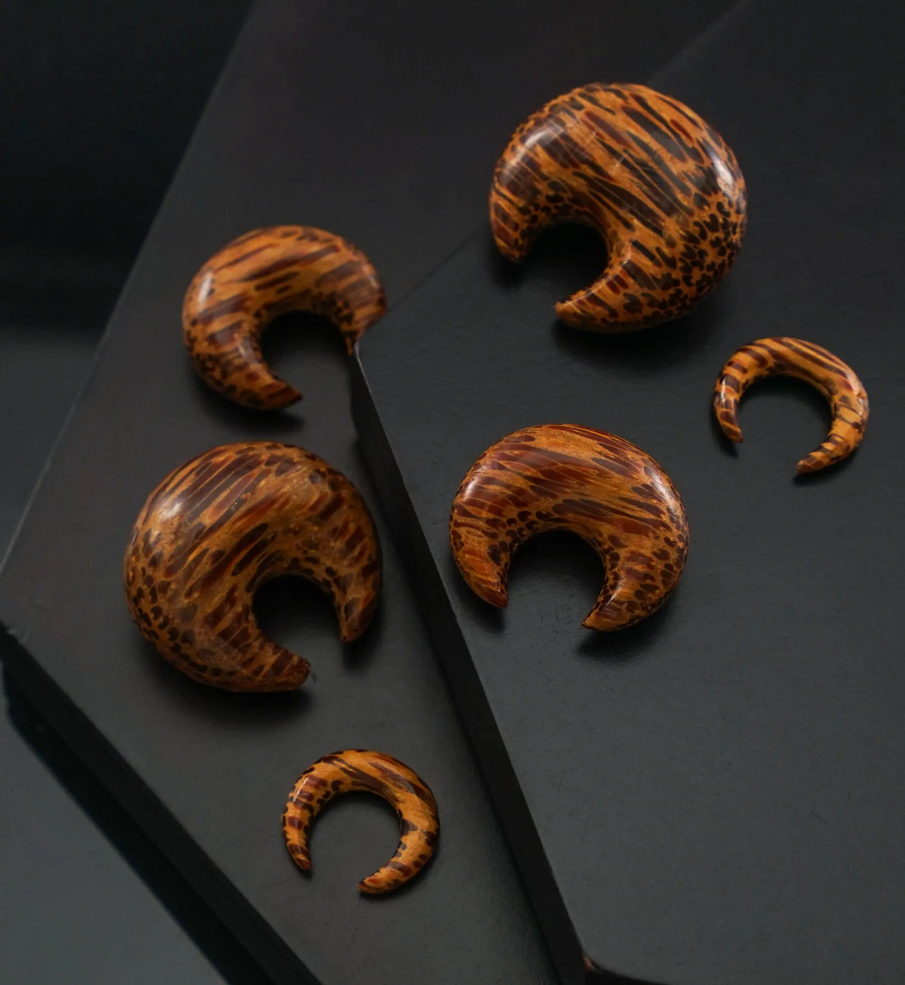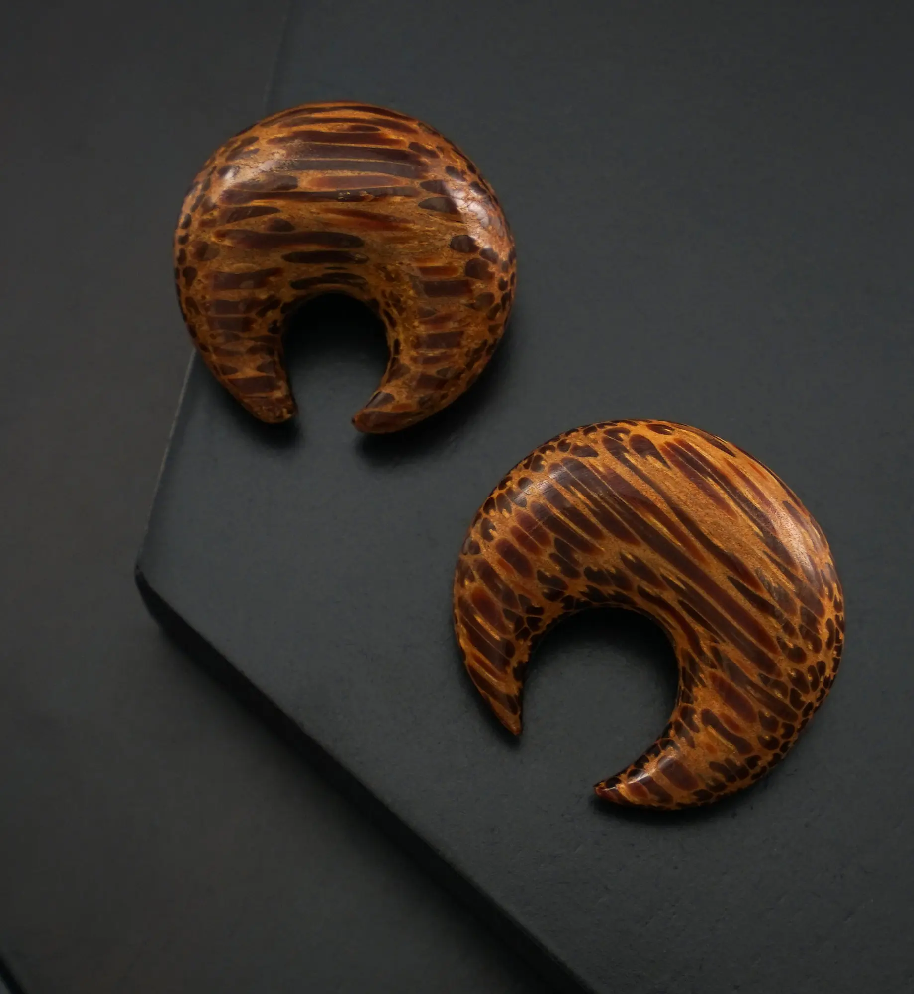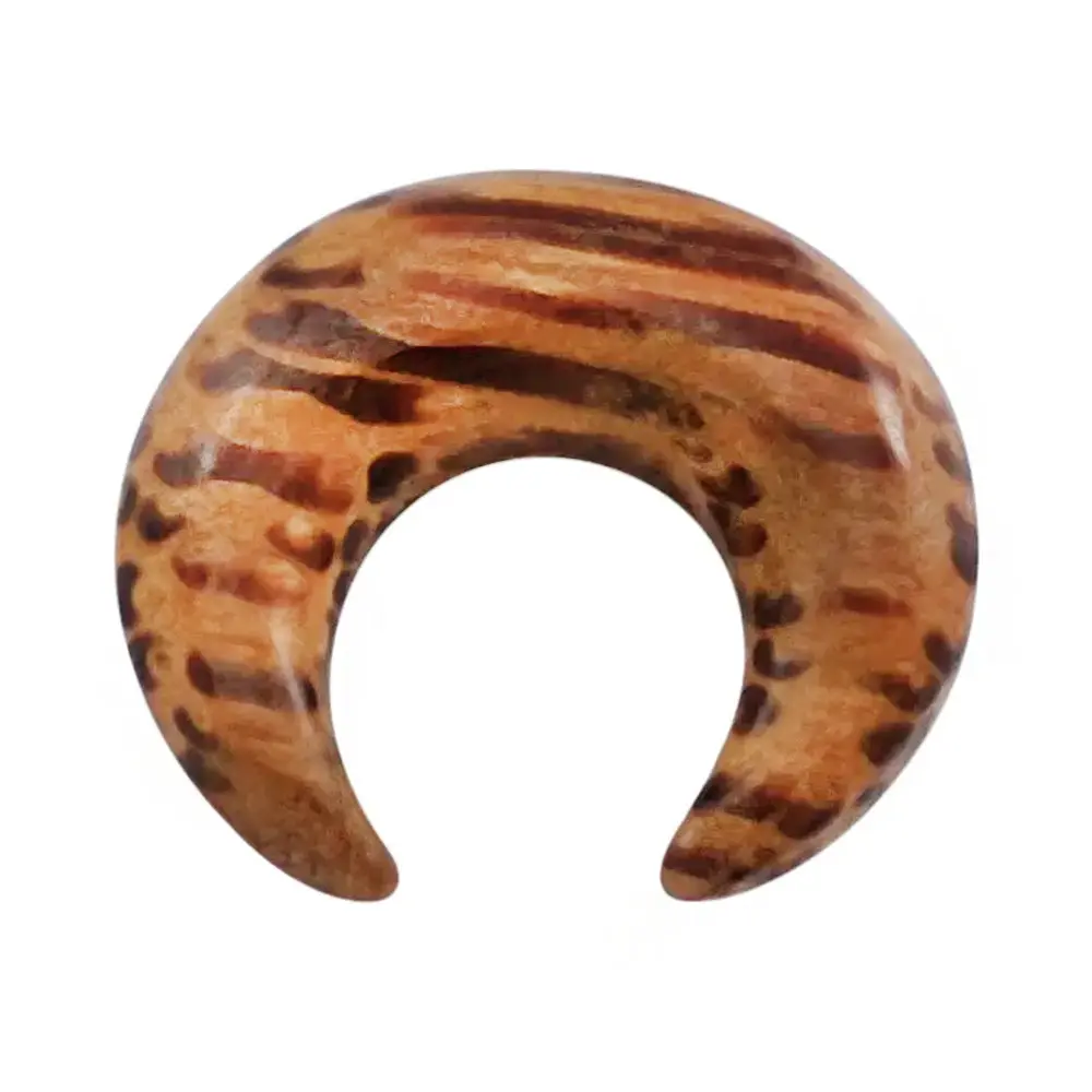 Septum pinchers handcrafted from patterned, coconut wood. Polished and smooth. Available in sizes 8G (3mm) - 1/2" (13mm). You can wear these in your stretched septum or stretched ears! Do not use these to stretch your septum or ears. Please note that each piece will be one of a kind in color and pattern due to the nature of the coconut wood. Sold individually (1pc). Purchase 2 for a pair. See below for full measurements of each size.