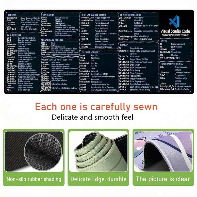 Coding Visual Studio Code Shortcuts Keyboard Mouse Pad, Non-slip Rubber Base Stitched Edge Desk Pad, Office Desk Accessories for Laptop Desktop