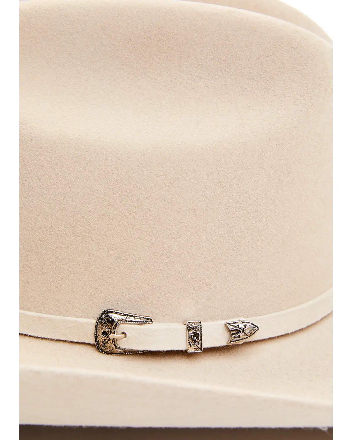 Wool felt construction. Cattleman crease. Western crown. 4 1/4" square front brim. Synthetic leather sweatband. Three-piece buckle self band. 3X. Silverbelly. Made in the USA with USA and globally sourced materials. Handcrafted.