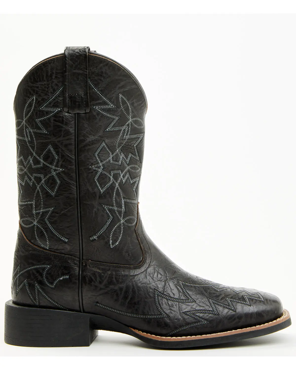 Full-grain leather upper with mesh lining. Broad square toe. Pull-on style with pull tabs. PU insole. Solid black with geo stitching throughout. Double-stitched welt. Slip-resisting rubber outsole. 11" shaft height. 1.5" stockman heel. Imported.