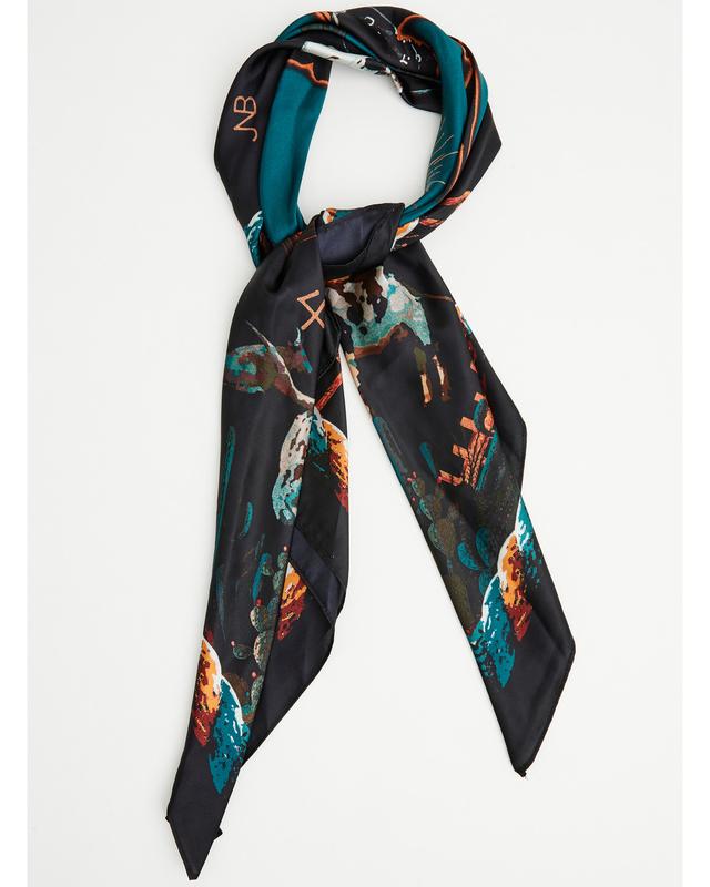 100% silky polyester. 41" x 41". Cowboy desert print with Southwestern and branded details. Imported.