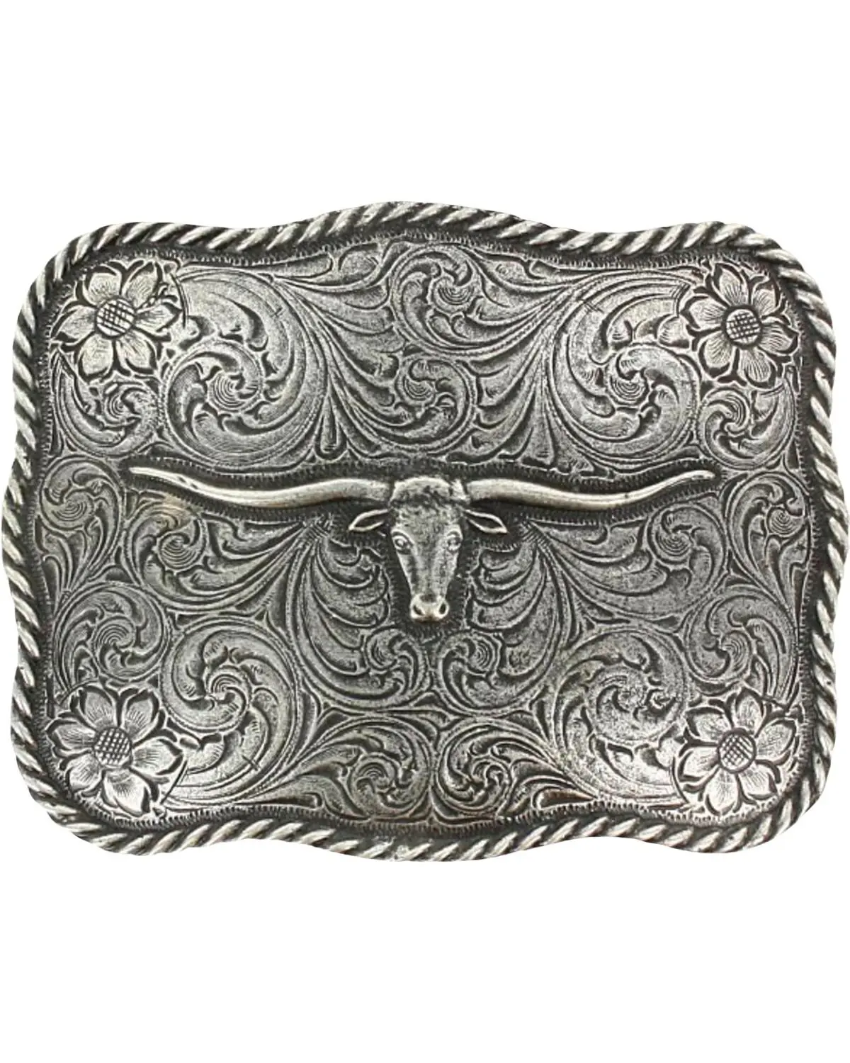 Silver-toned belt buckle. Rectangular shape. Longhorn center. Twisted rope trim. Floral and filigree background. Dimensions: 3.75" x 2.75". Imported.
