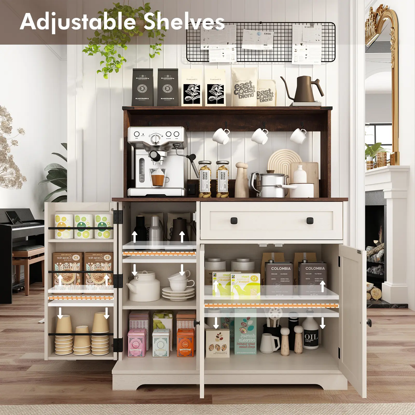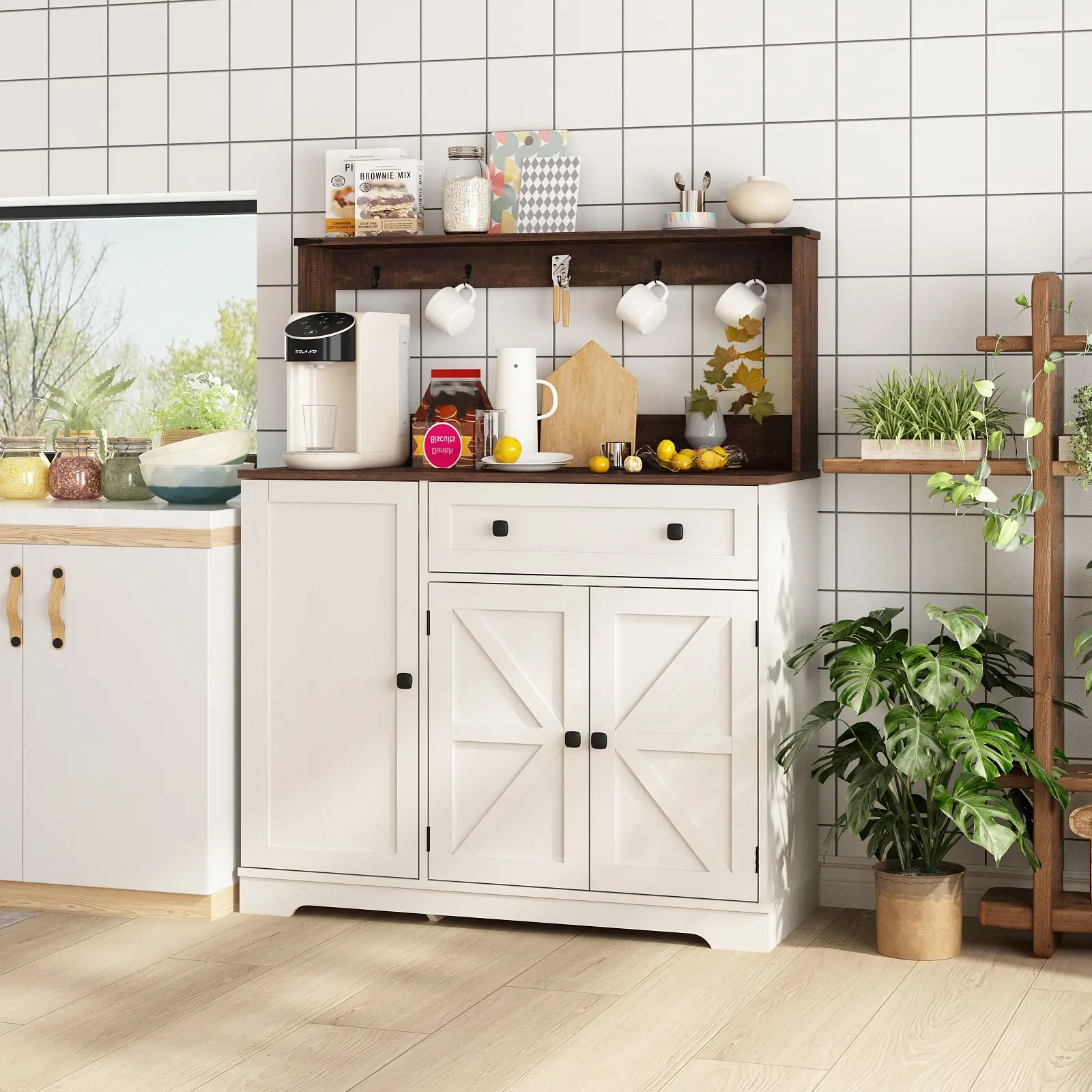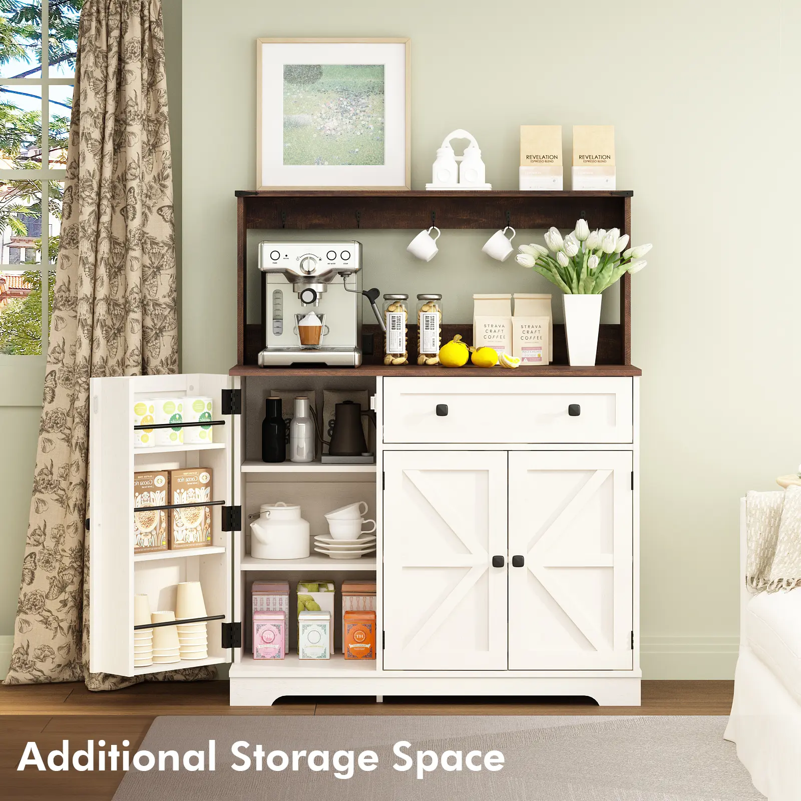 Absolutely love this coffee bar cabinet! It’s the perfect blend of functionality and style. The storage space is generous — enough to hold all my mugs, coffee pods, and even my espresso machine on top! It’s a must have for the price!