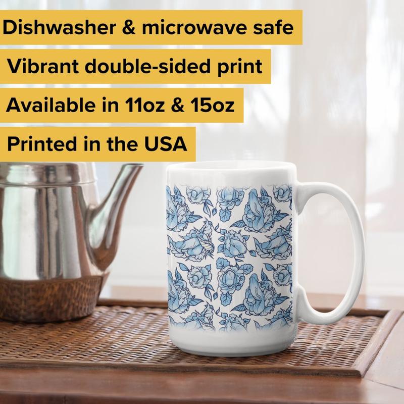 Looking for a new french toile pattern mug? Something that is nice flowery and with mildly offensive genitalia to your mother once she stares at it too long? This subtle floral p pattern is for you! Our Mug features large handles for easy gripping and a wrap-around print. These heavy-duty Mugs are both dishwasher and microwave safe. Printed in the USA