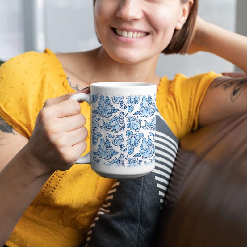 Floral Blue Ceramic Coffee Mug – Reusable & Washable Drinkware with Handle