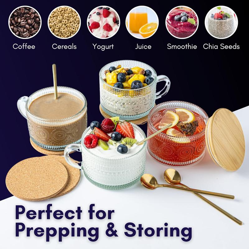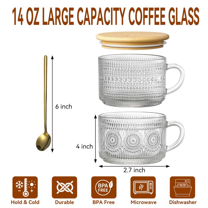 Large Capacity: the glass cup set has a large capacity of 14 ounces, which can be used to enjoy not only coffee and tea, but also a variety of beverages such as yogurt, juice, ice cream, milk, overnight oats and desserts.