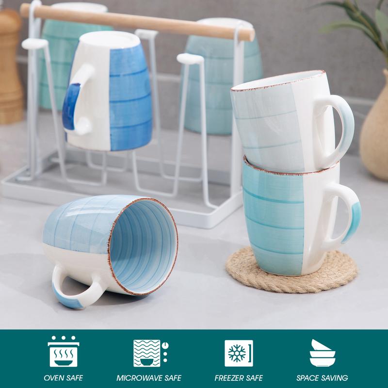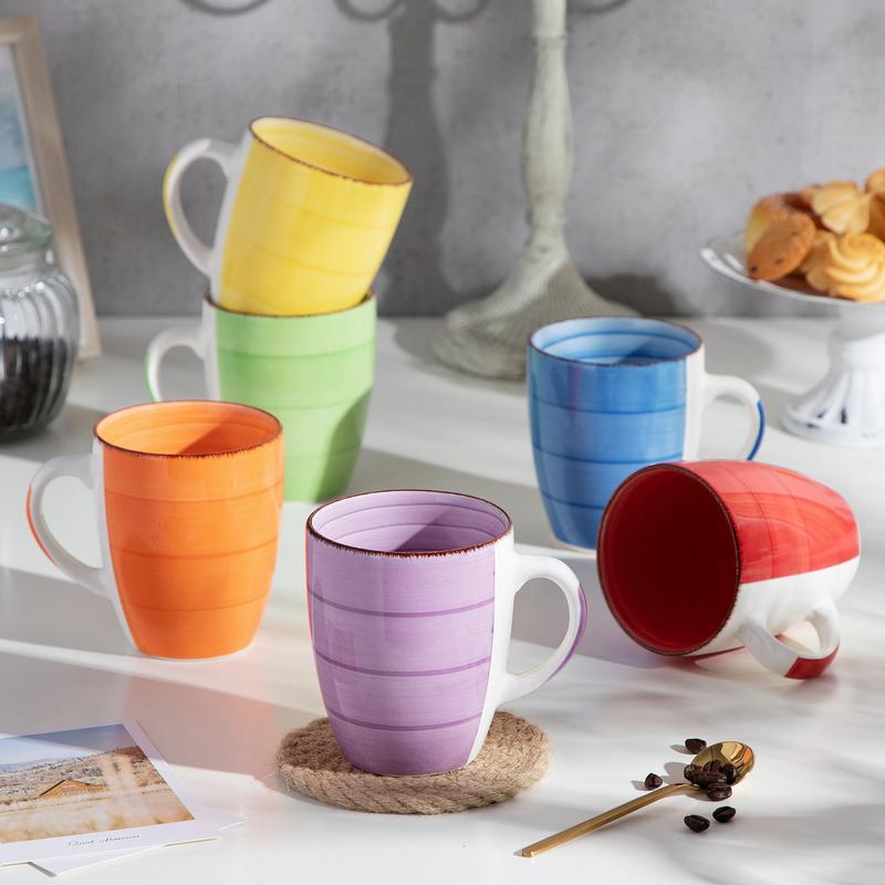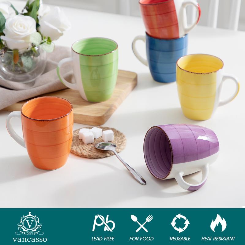 This set of mugs measures 4.4 * 4 inches / 12 ounces and is suitable for any coffee lover.The colourful mug set are coloured by inorganic pigments at high temperatures, no fading and long lasting.Also this coffee cups is dishwasher and microwave safe.