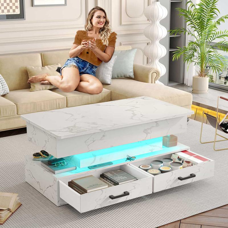 5. SEDETA 40-inch Faux Marble Rectangular Coffee Table with Drawers & LED Lights Living Room Furniture Foldable Height Adjustable Storage Compartment