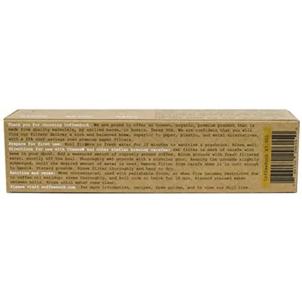 CoffeeSock “The Original” Reusable Coffee Filters are a premium, zero-waste alternative to disposable paper filters, designed to perfectly fit Chemex® 3-cup brewers. Made from 100% organic cotton, these cloth filters enhance coffee’s natural oils and aromas for a smoother, richer, full-bodied cup with every brew. This convenient 2-pack offers long-lasting durability and easy reuse while helping reduce everyday waste. Eco-friendly and compostable at end of life, CoffeeSock filters combine classic pour-over quality with sustainable design, making them an ideal choice for coffee lovers who care about flavor and the environment.