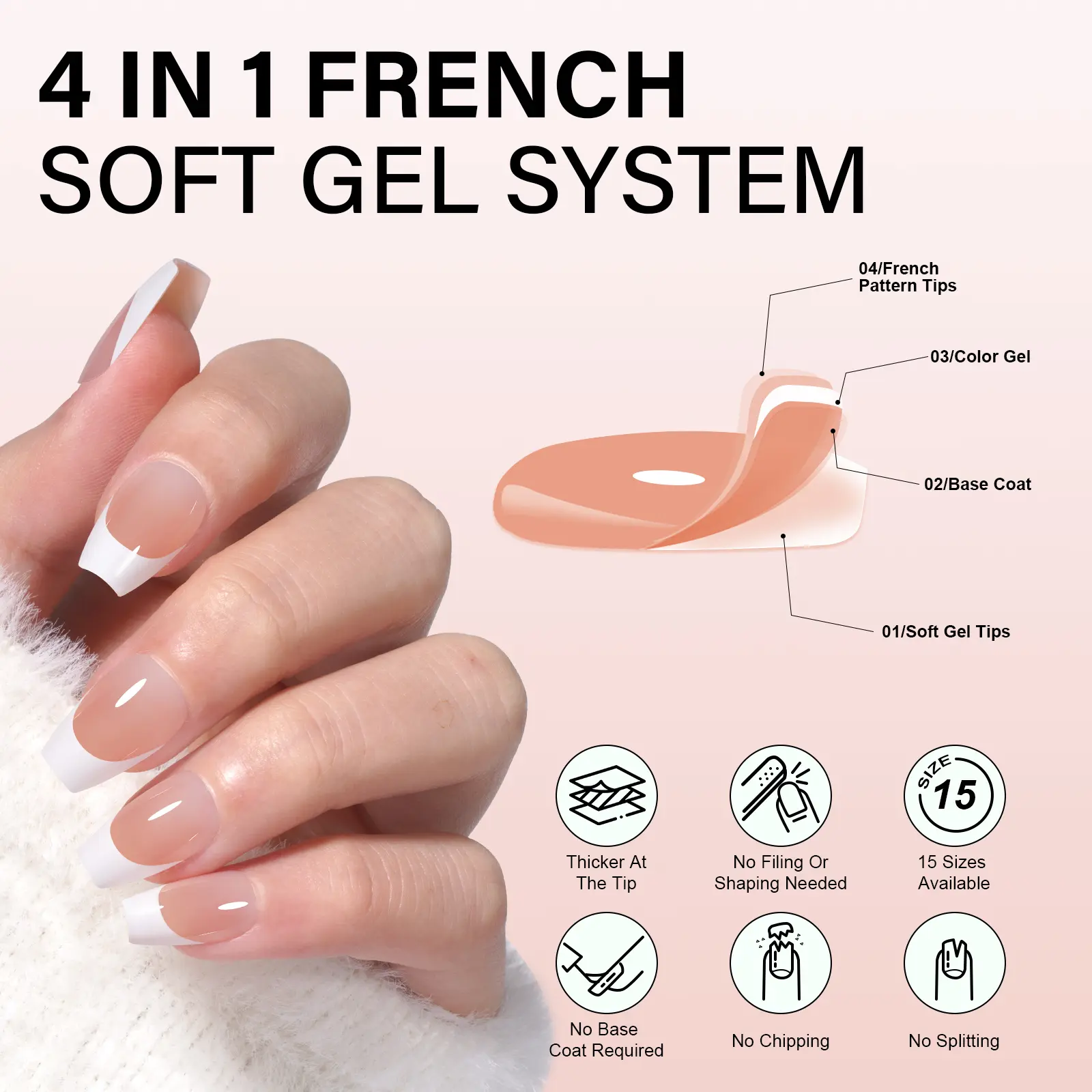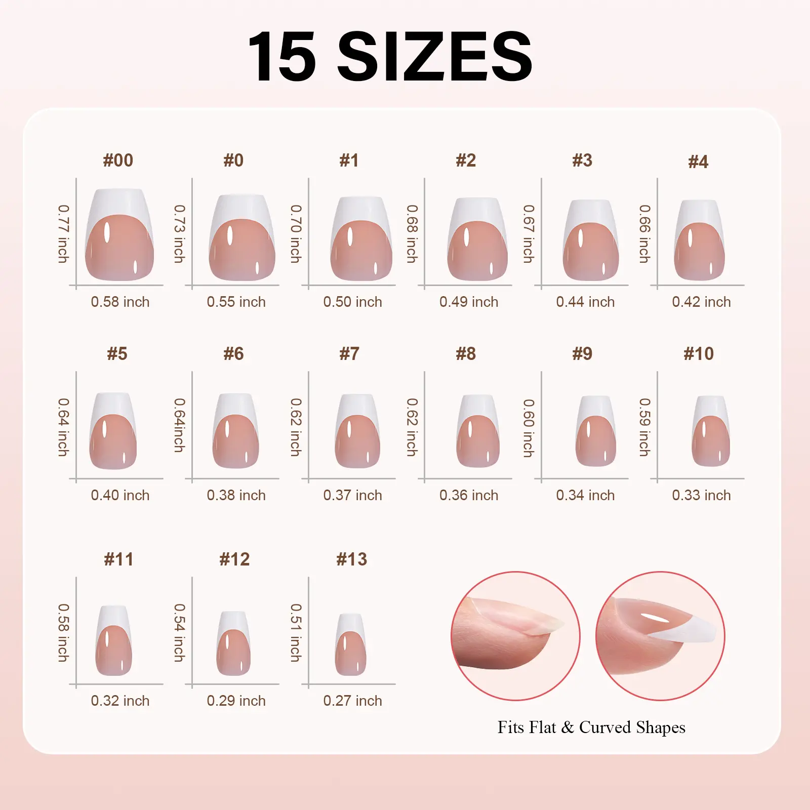 MULTI-SIZE SELECTION: Set comes in 15 different sizes in total 180pcs press-on French tip nails in classic, neutral designs. The fake nail tips provide you with more choices. You can quickly fit the size and widely adapt to different sizes of finger requirements.QUICK AND EASY APPLICATION: Create unique looks with just one builder gel and one top coat (required). Then you can create your unique design in fewer steps