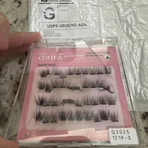 Product arrived on time, however package is damaged and lashes are not in place. Lashes are stuck on top of the broken plastic lid.