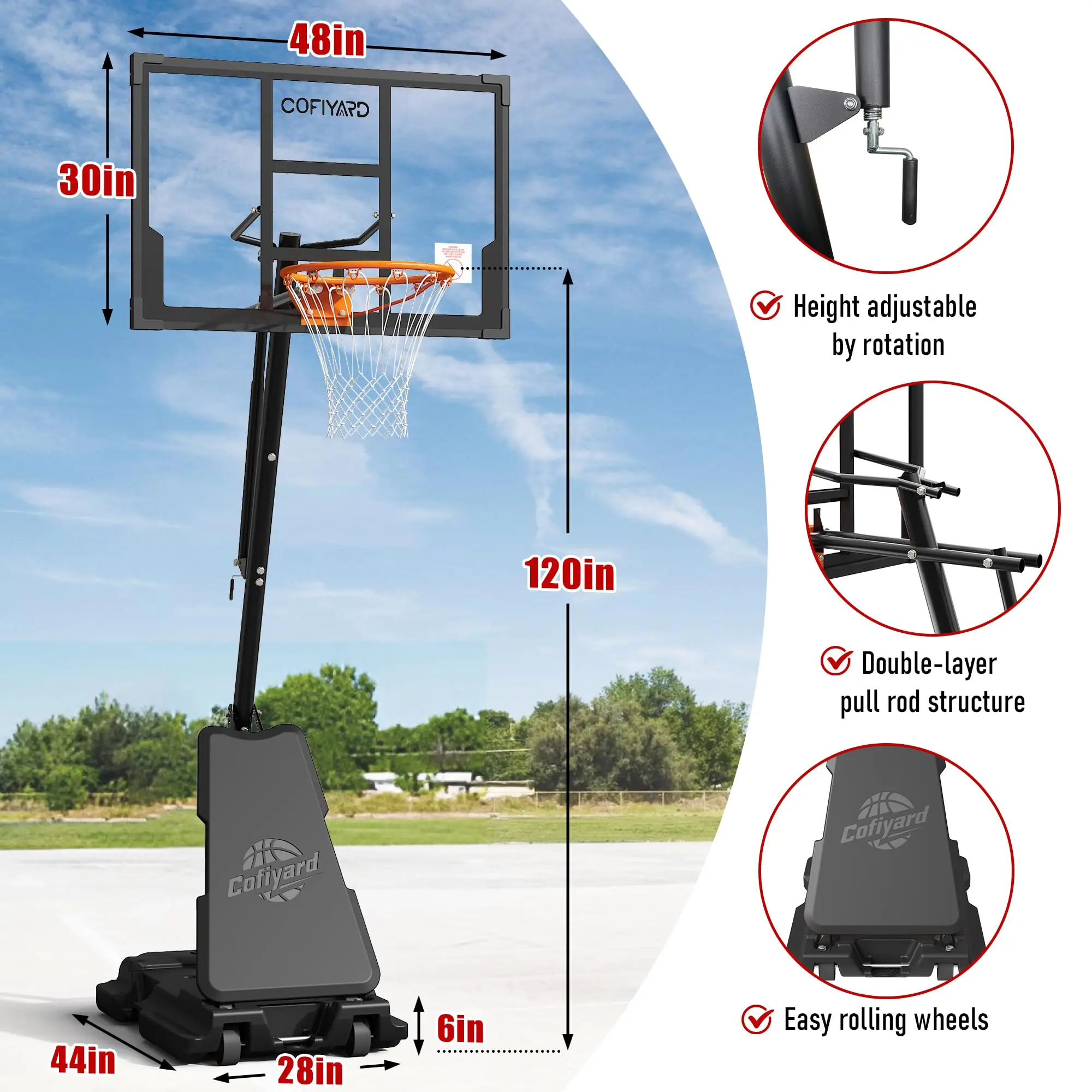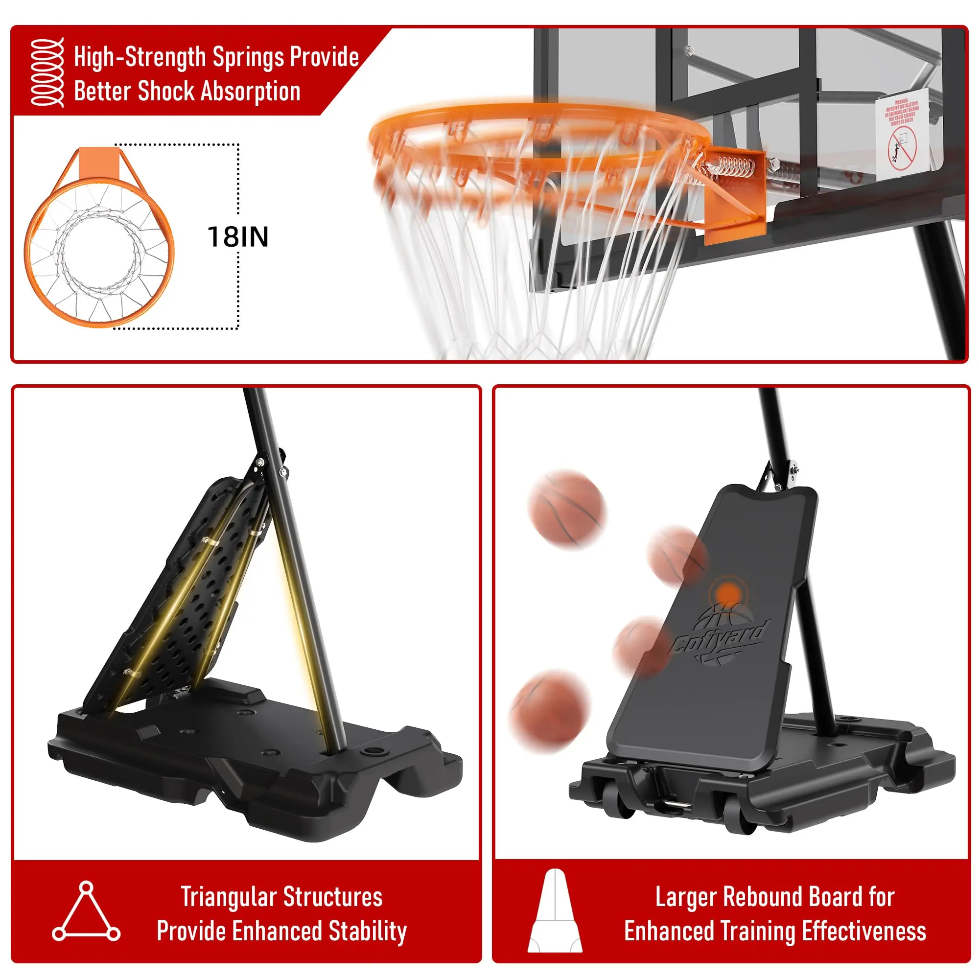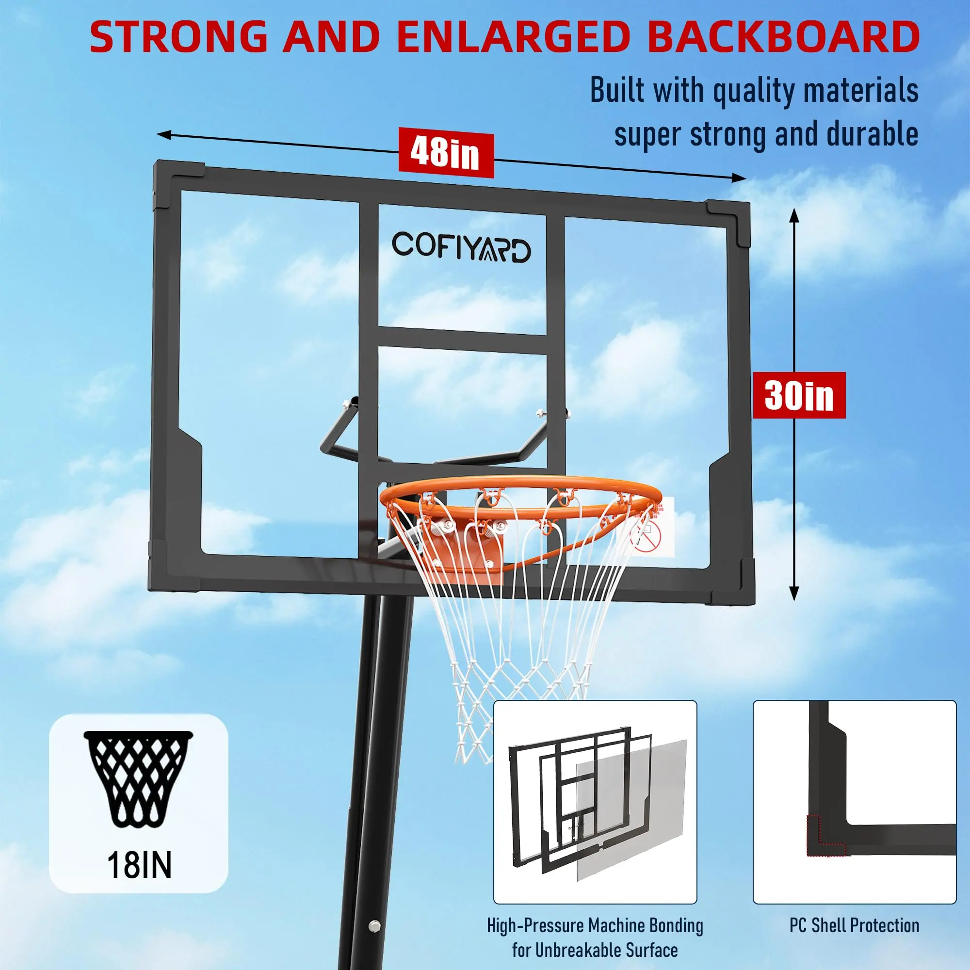 ·Sturdy Thickened PC backboard: Cofiyard 48IN basketball backboard is made from premium thickened materials to withstand impact and various shots. Excellent visibility and impact resistance, PE shell protection and shock-absorbing feature provides safety and stability during play