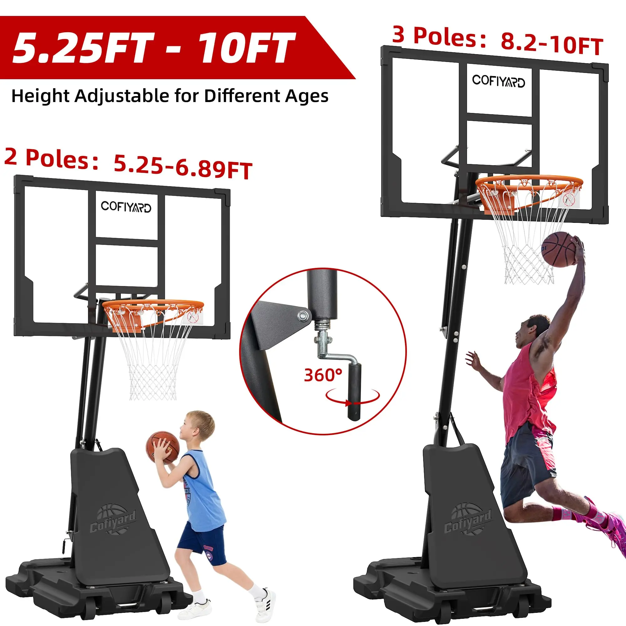 ·5.25-10FT Height Adjustment: The innovative rotatable mechanism features a flexible 2 or 3 poles system allows easy height adjustments from 5.25 to 10 feet, accommodating users of all heights. Easy for youth to use, enhancing the flexibility and versatility of the game