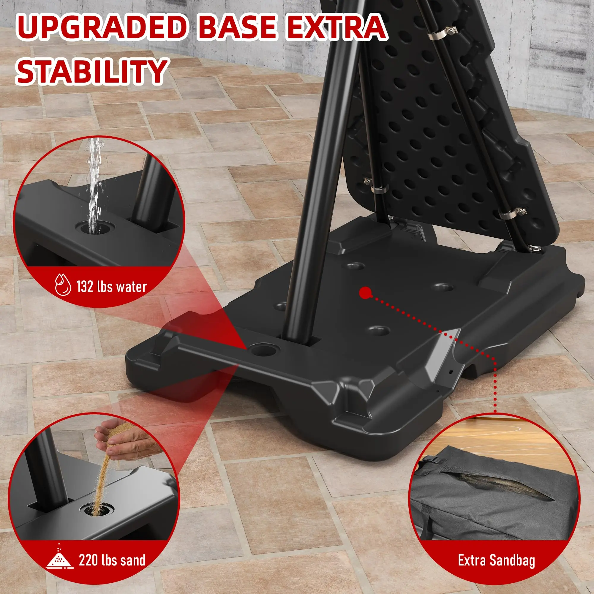 ·Extra Large Stable Base with Extra Sandbag: The base measures 44 inches and has a water capacity of 132lbs. Our additional sandbag (No sand) is designed to stabilise the base and secure the base of the portable basketball hoop, greatly reducing the chances of the hoop tipping over