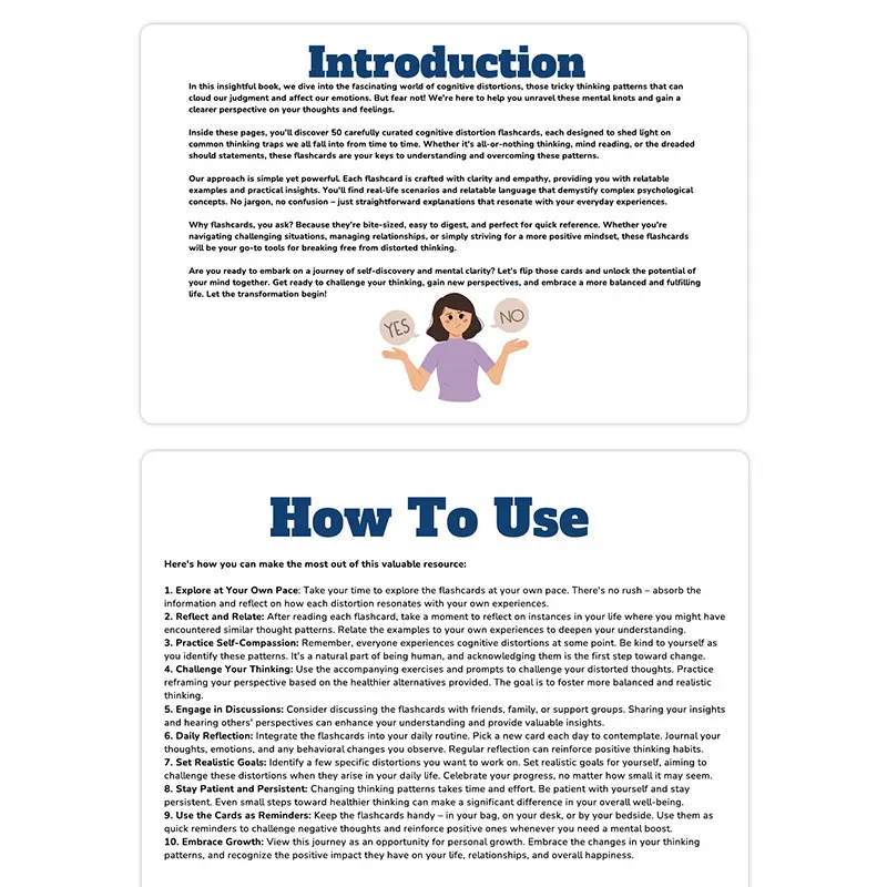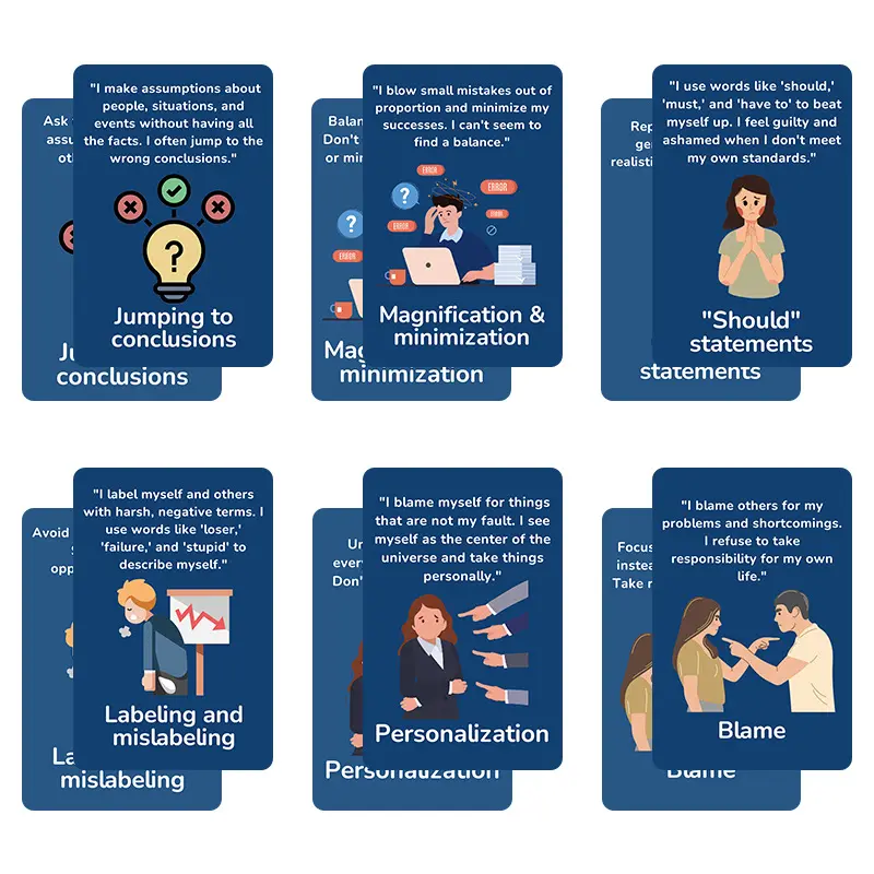【Cognitive Tools】: Utilize cognitive distortion cards to identify and understand mental traps impacting your thoughts and behavior.