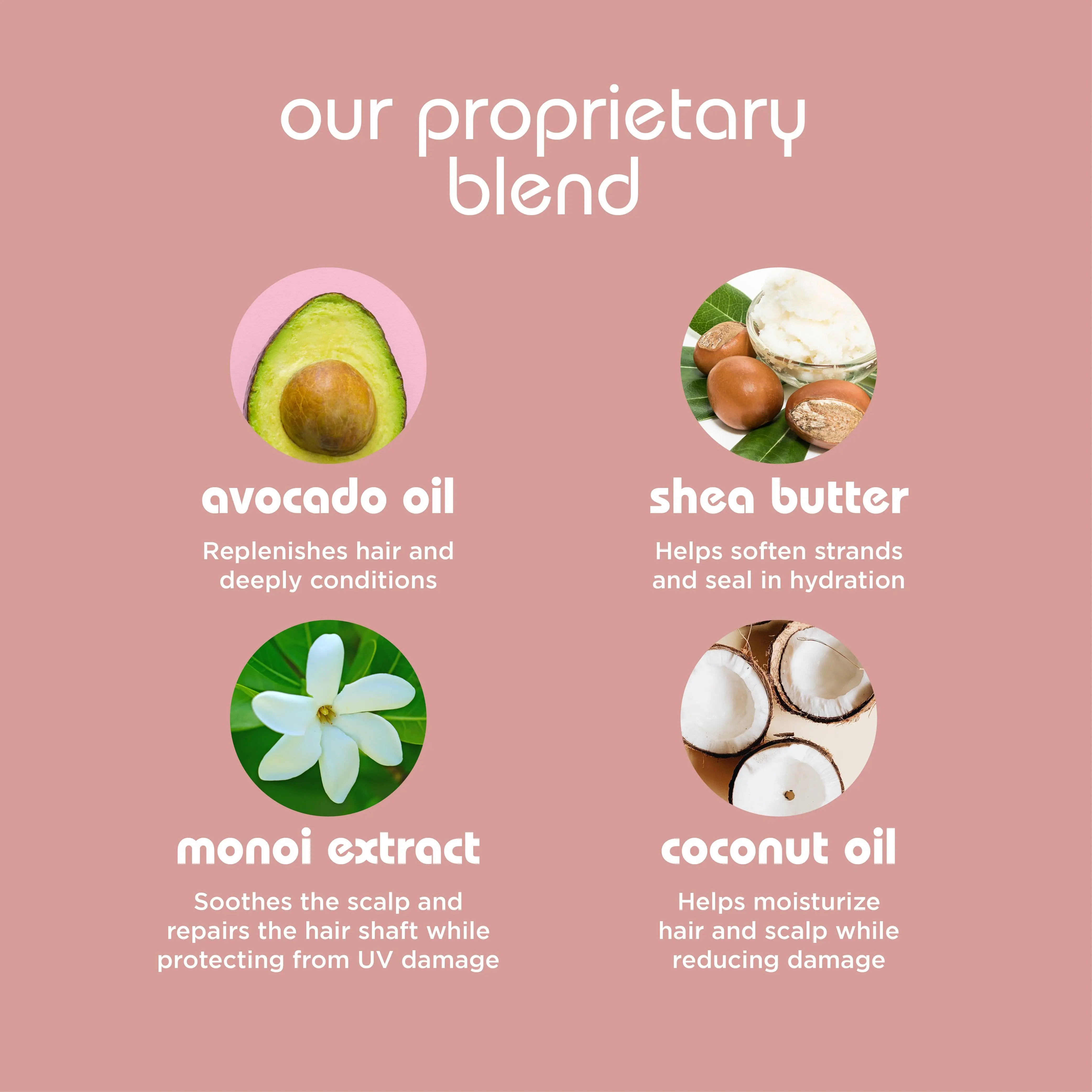 | Ingredients | Water,Cetearyl Alcohol,Behentrimonium Chloride,Glycerin,Cocos Nucifera (Coconut) Oil,Cetyl Esters,Isopropyl Alcohol,Vegetable Oil,Butyrospermum Parkii (Shea) Butter,Mangifera Indica (Mango) Seed Butter,Persea Gratissima (Avocado) Oil,Hydrolyzed Pea Protein,Panthenol,Hydrolyzed Rice Protein,Gardenia Taitensis Flower Extract,Amodimethicone,Quaternium-91,Disodium EDTA,PEG-4 Laurate,Myristyl Myristate,Trideceth-12,Cetrimonium Chloride,Citric Acid,DMDM Hydantoin,Iodopropynyl Butylcarbamate,Sodium Benzoate,Fragrance |